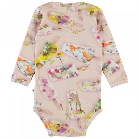 Fonda fra Molo er en skøn langærmet og rosafarvet body med lækre, inbydende ispinde.Bodyen har smalle ribkanter i alle åbninger. Den lukkes med trykknapper ved skuldre og imellem ben, som gør den let at få af og på igen.
