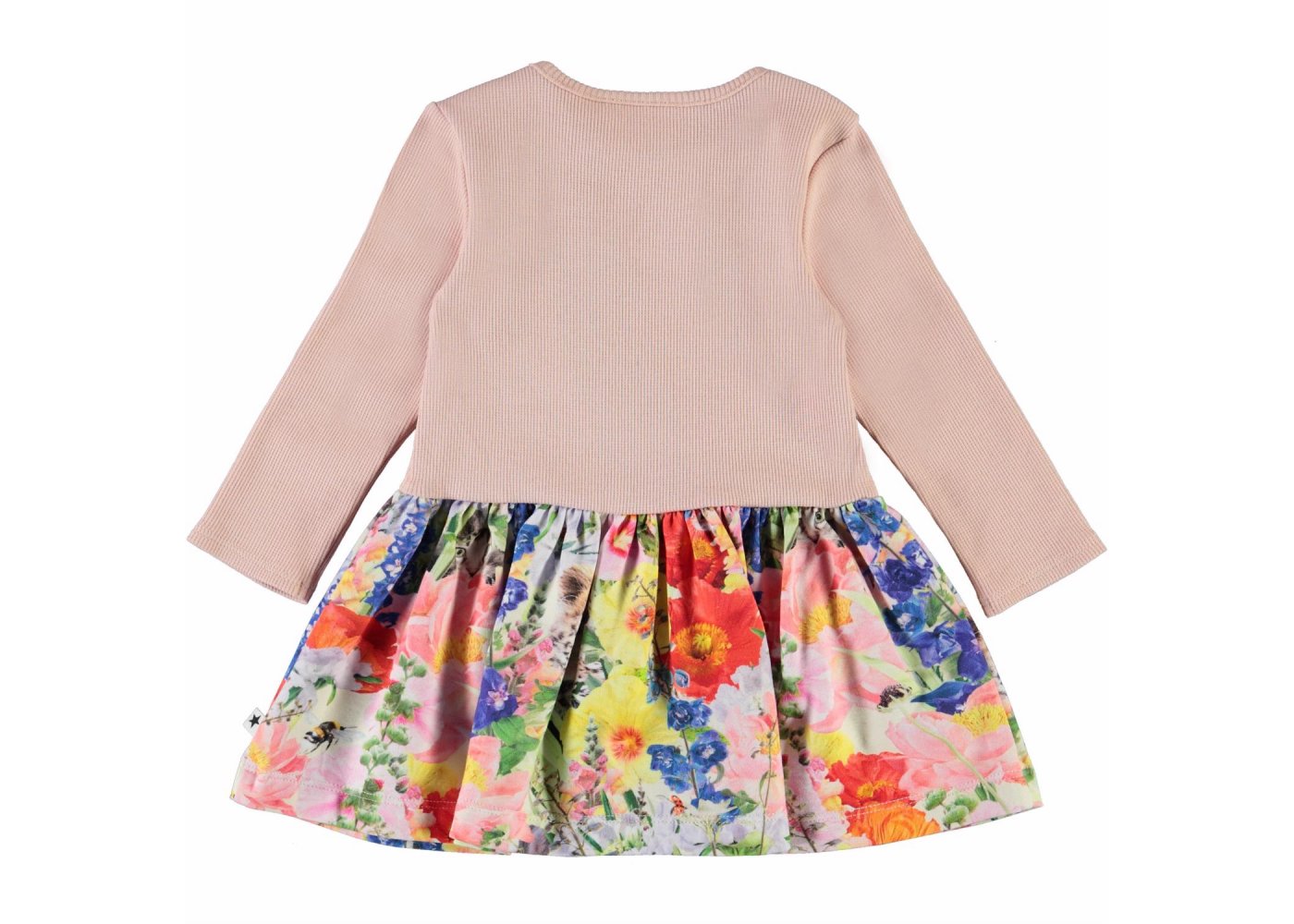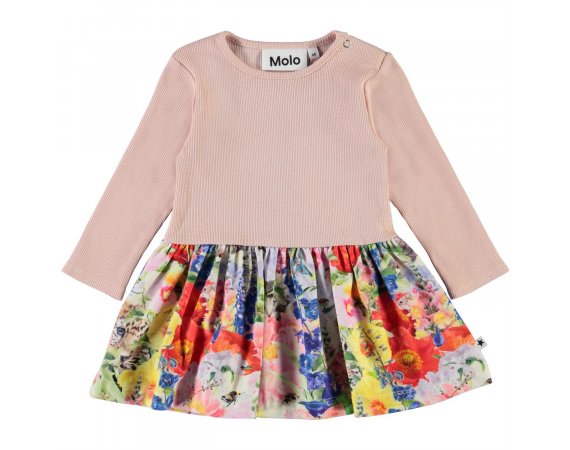 Carel fra Molo er en skøn langærmet kjole med en ensfarvet overdel i rib, og et rynket skørt fyldt med blomster og søde søde dyr, som er gemt imellem blomsterne på skørtet.Kjolen lukkes med trykknapper på venstre skulder.