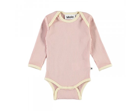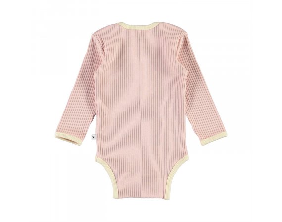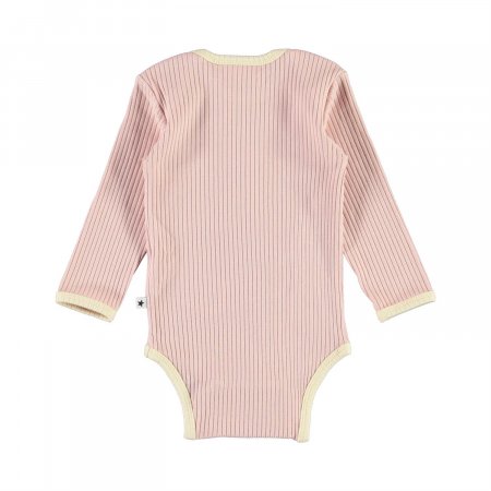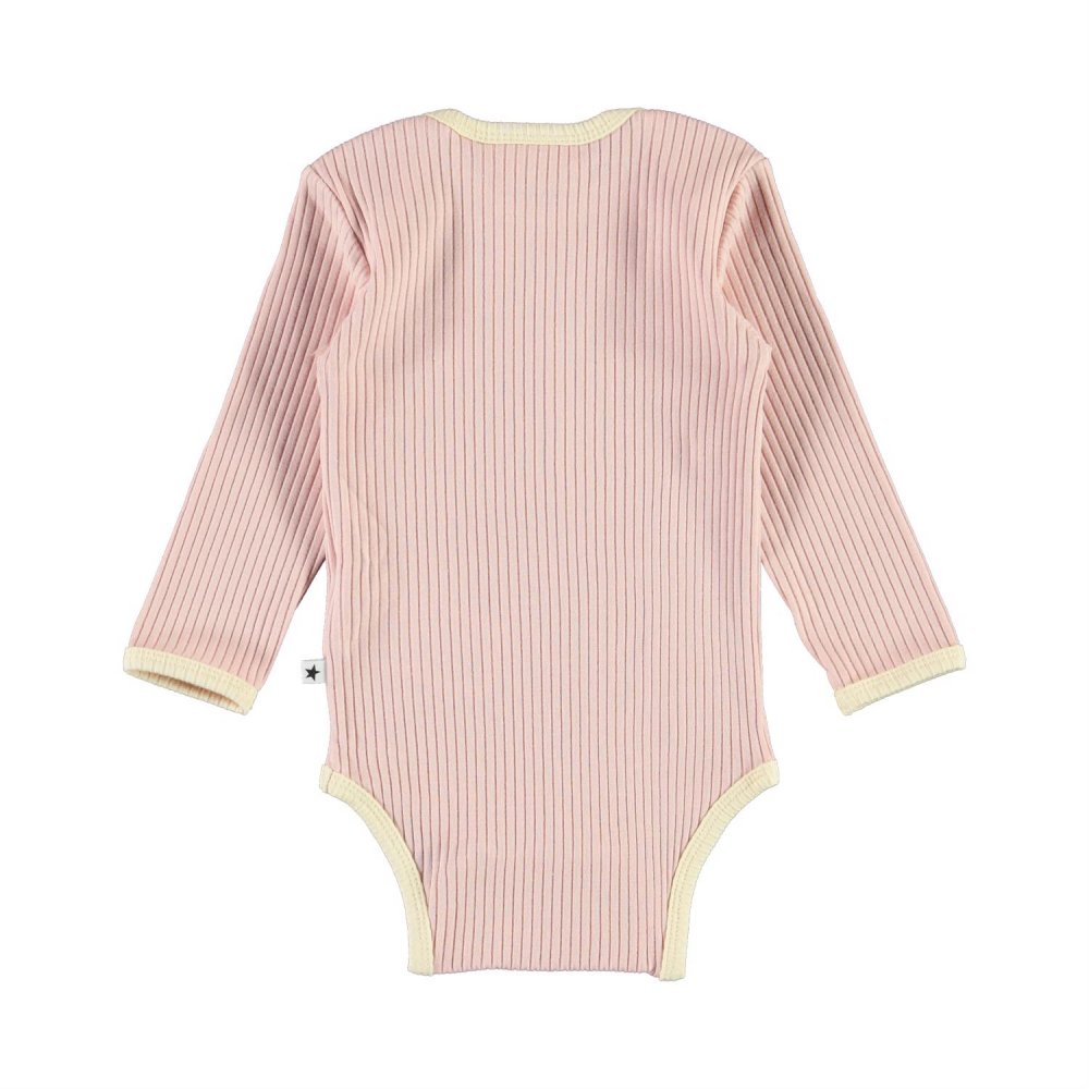 Fin rosa langærmet baby body i rib med beige kantbånd i alle åbninger.Bodyen har kuvertlukning på skuldre og lukkes med trykknapper imellem ben.