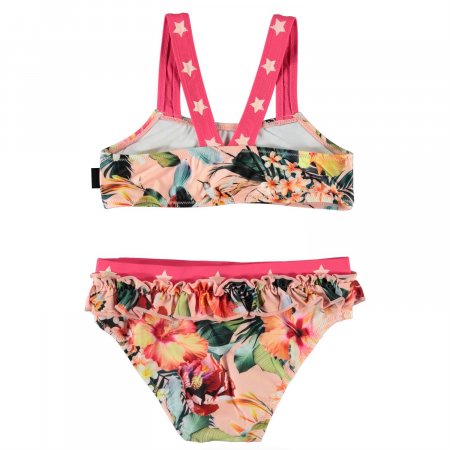 Sød bikini i lyserød med blomsterprint fra Molo.Bikinitoppen har brede pink skulderstropper med stjerner. Badebuksens elastikkant er pink med stjerner og har den sødeste flæse hele vejen rundt.
