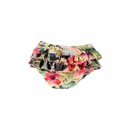 Søde ble-badebukser i lyserød med blomsterprint fra Molo.Badebuksen har elastikkant i livet, elastik ved benåbninger og to søde flæser hele vejen rundt.