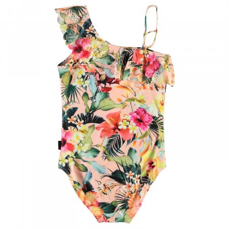 Sød badedragt i lyserød med blomsterprint fra Molo.Dragten er asymetrisk. Den ene skulderstrop er en skrå, bred flæsekant og den anden er en fin tynd strop, hvilket giver dragten en meget flot udtryk.