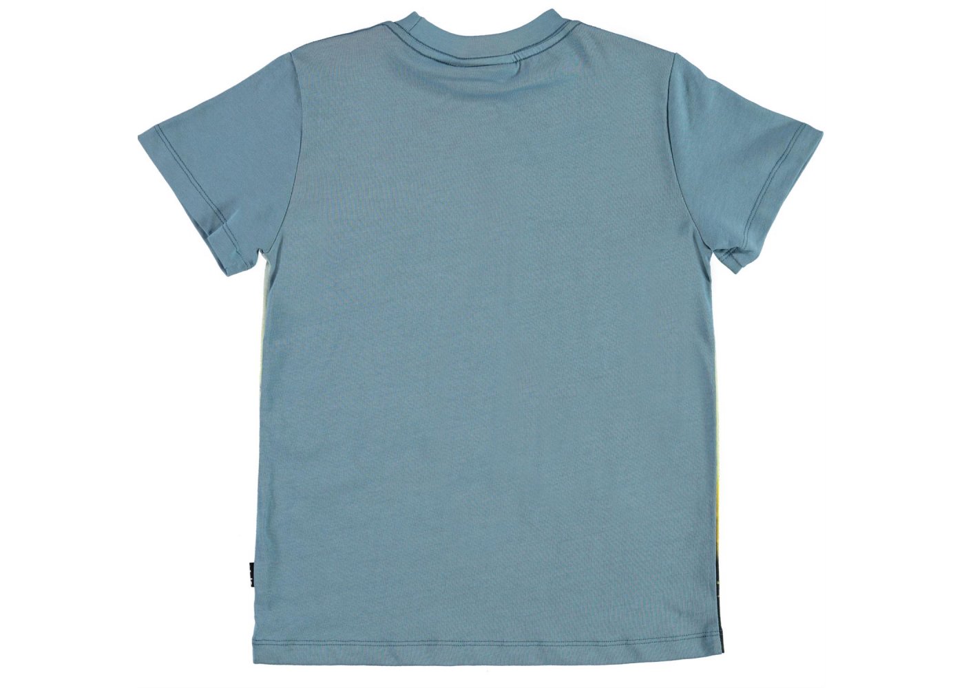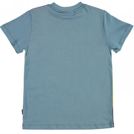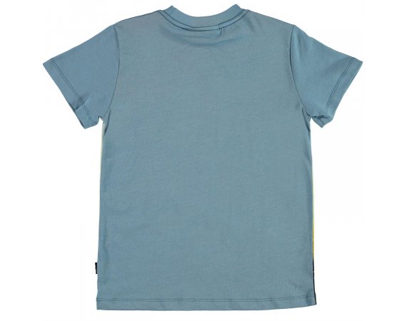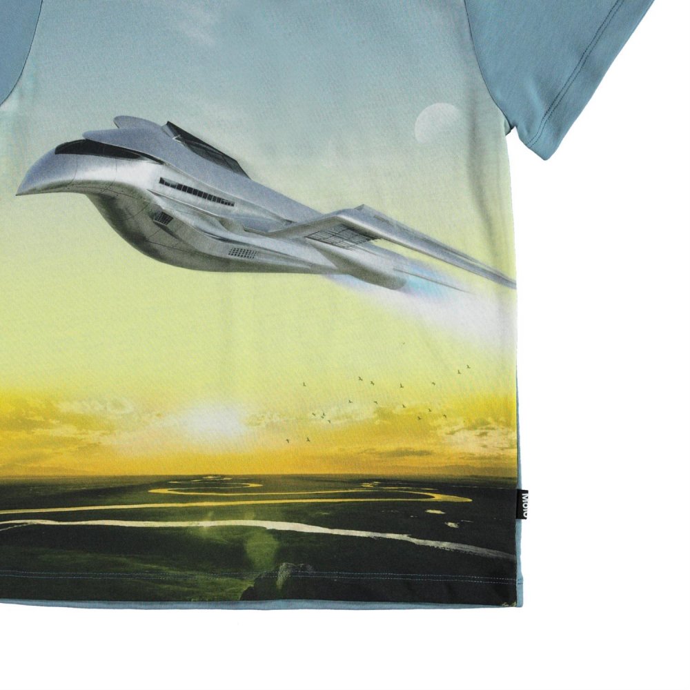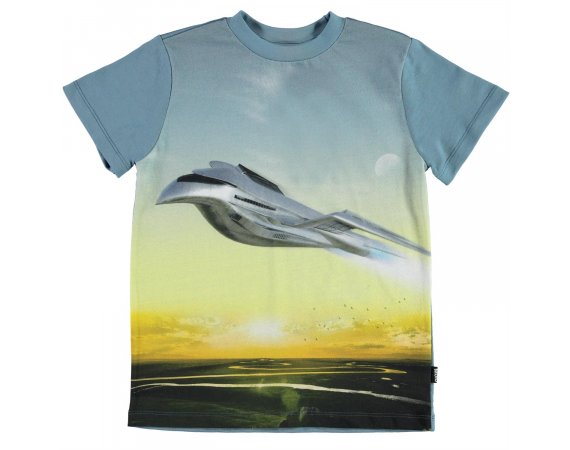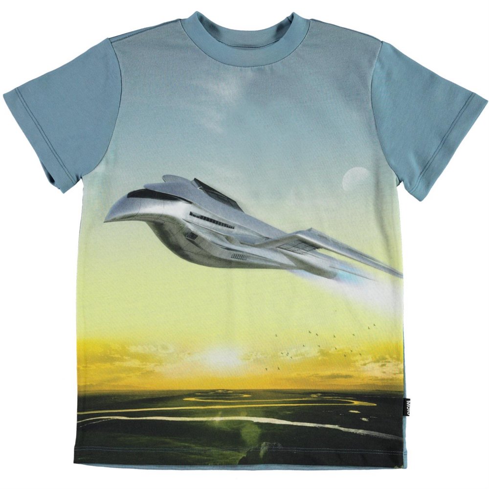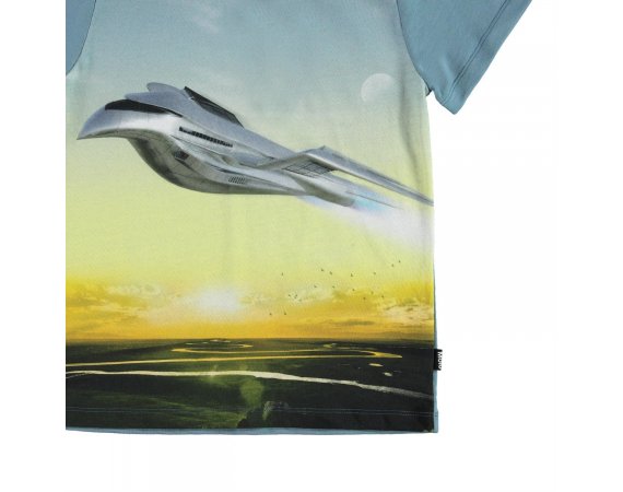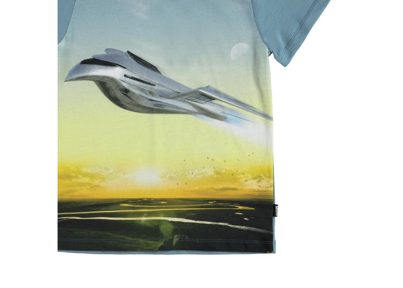 Skøn lyseblå t-shirt med print af et fremtids fly, der flyver over havet i flot solnedgang.