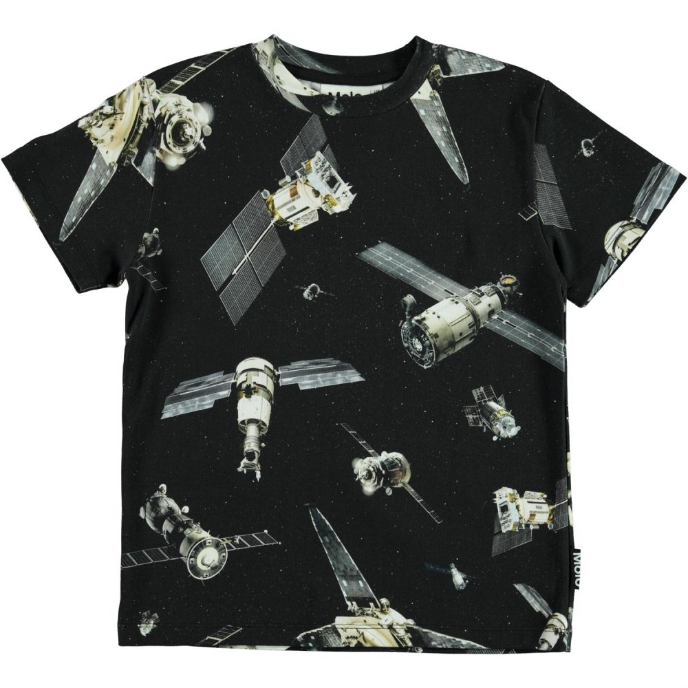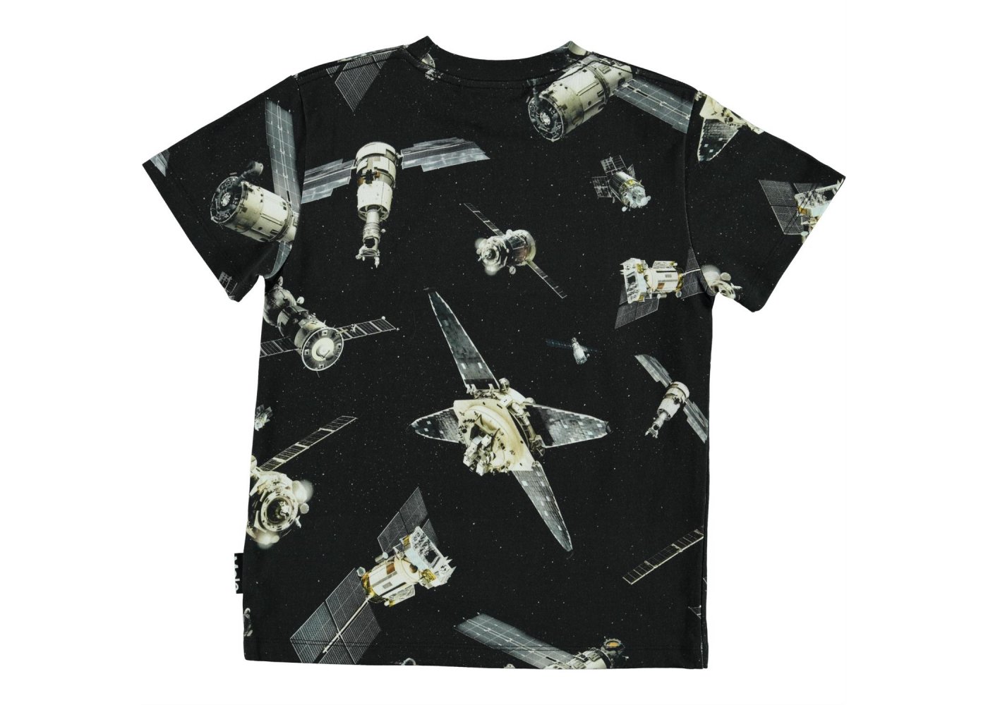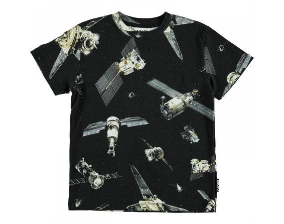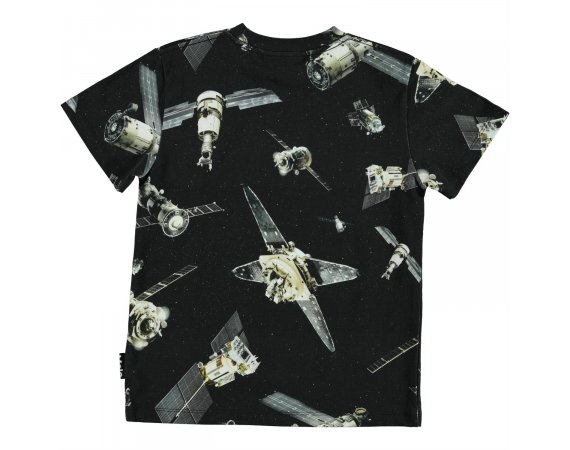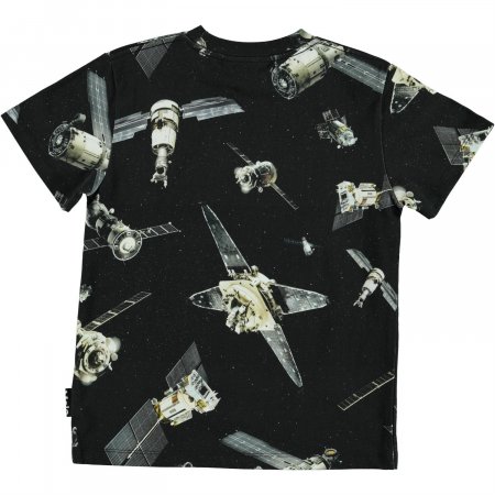 Sej sort t-shirt med print af satellitter der flyver rundt imellem hinanden i himmelrummet.