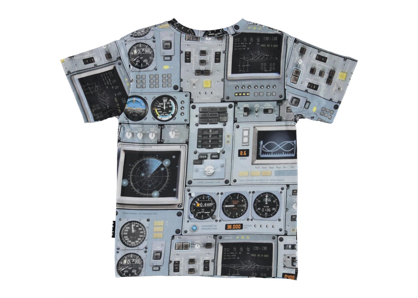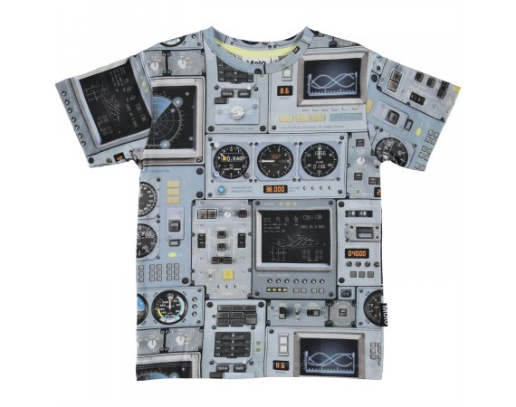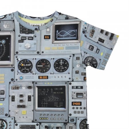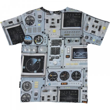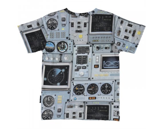 Fed blå t-shirt med print af et cockpit fra et rumskib eller et fly.