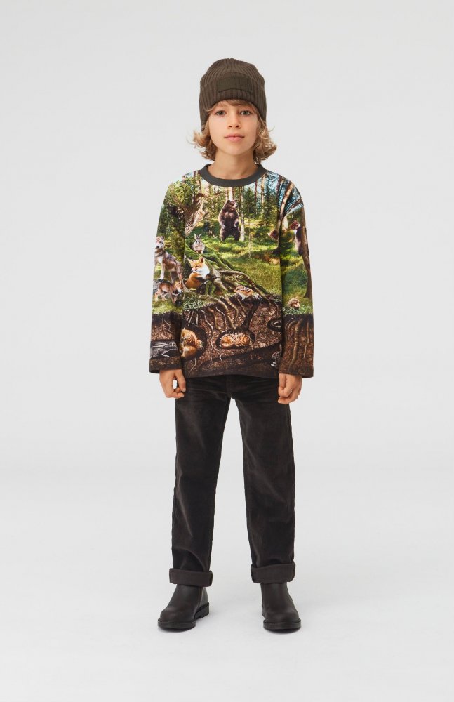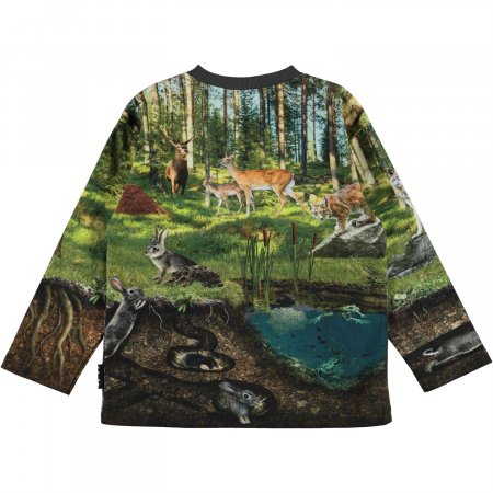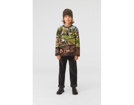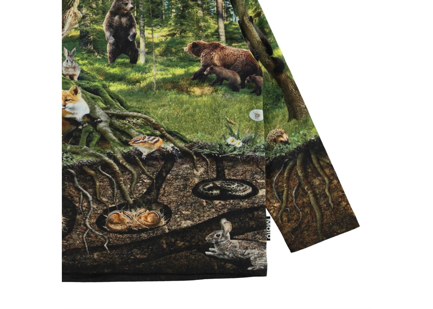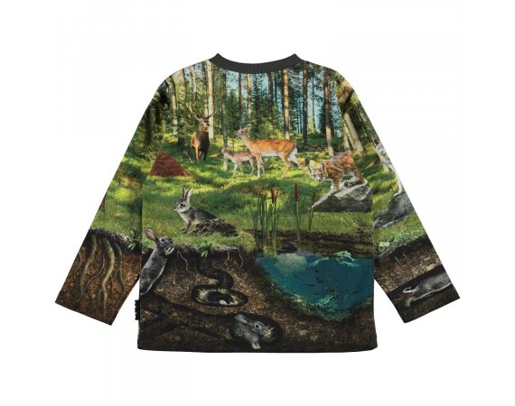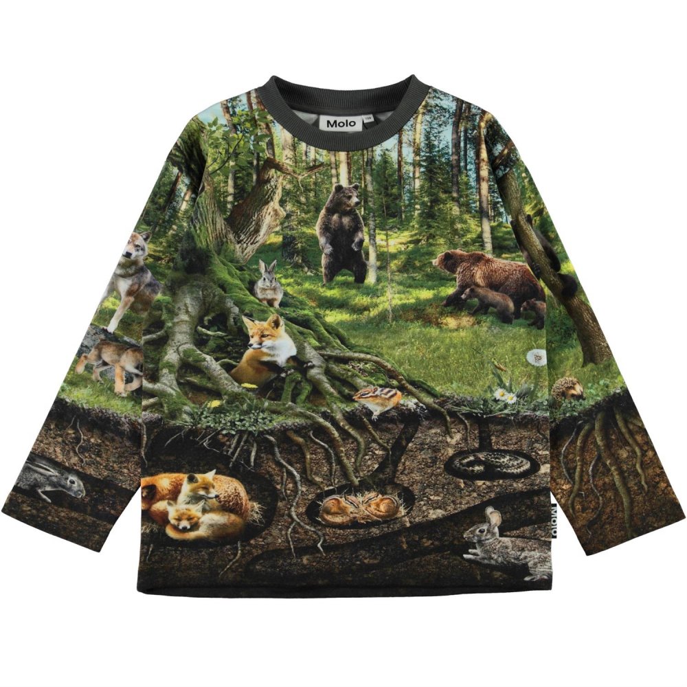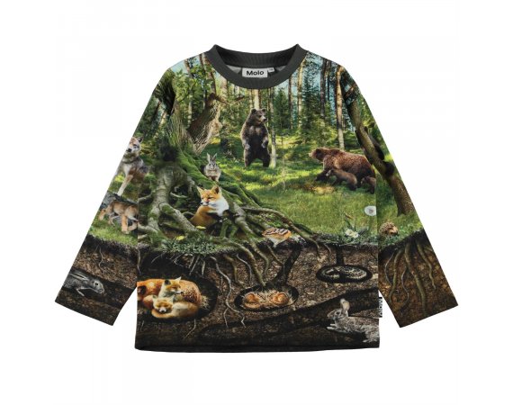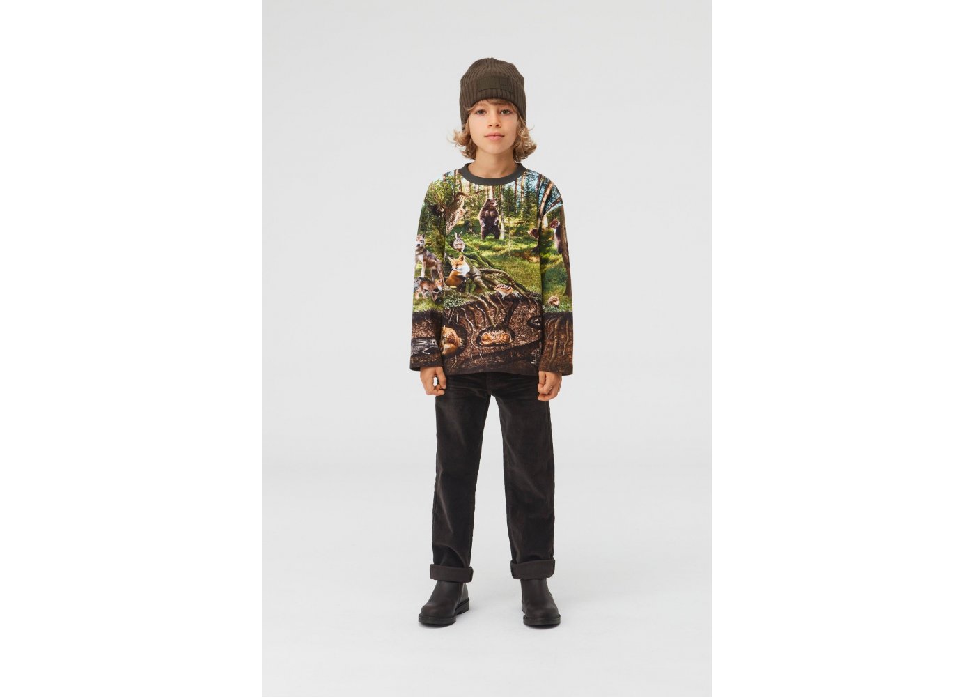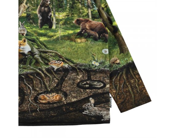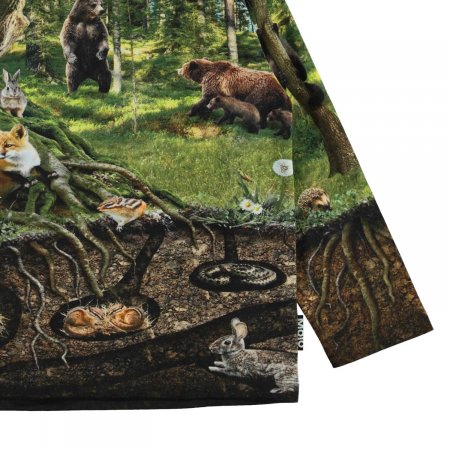 Sweatshirten har ribkant i halsudskæring og viser flot et billede af skov og huler under jorden med søde ræve og en farlig slange.