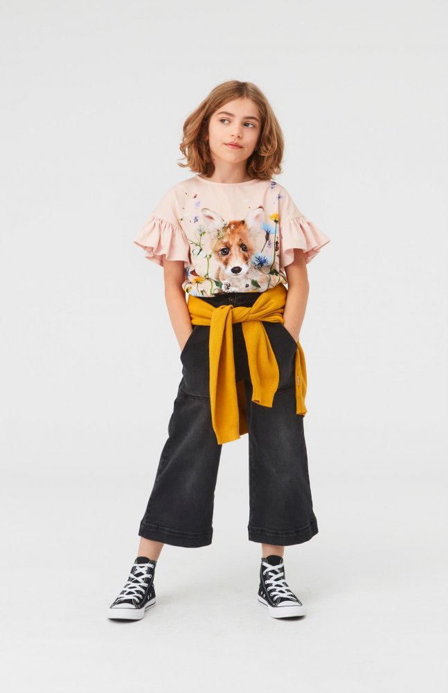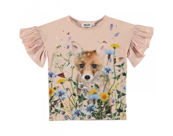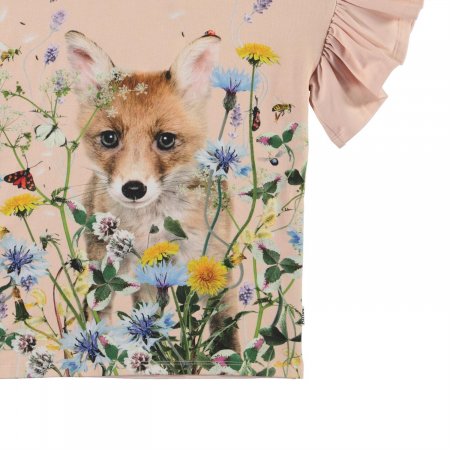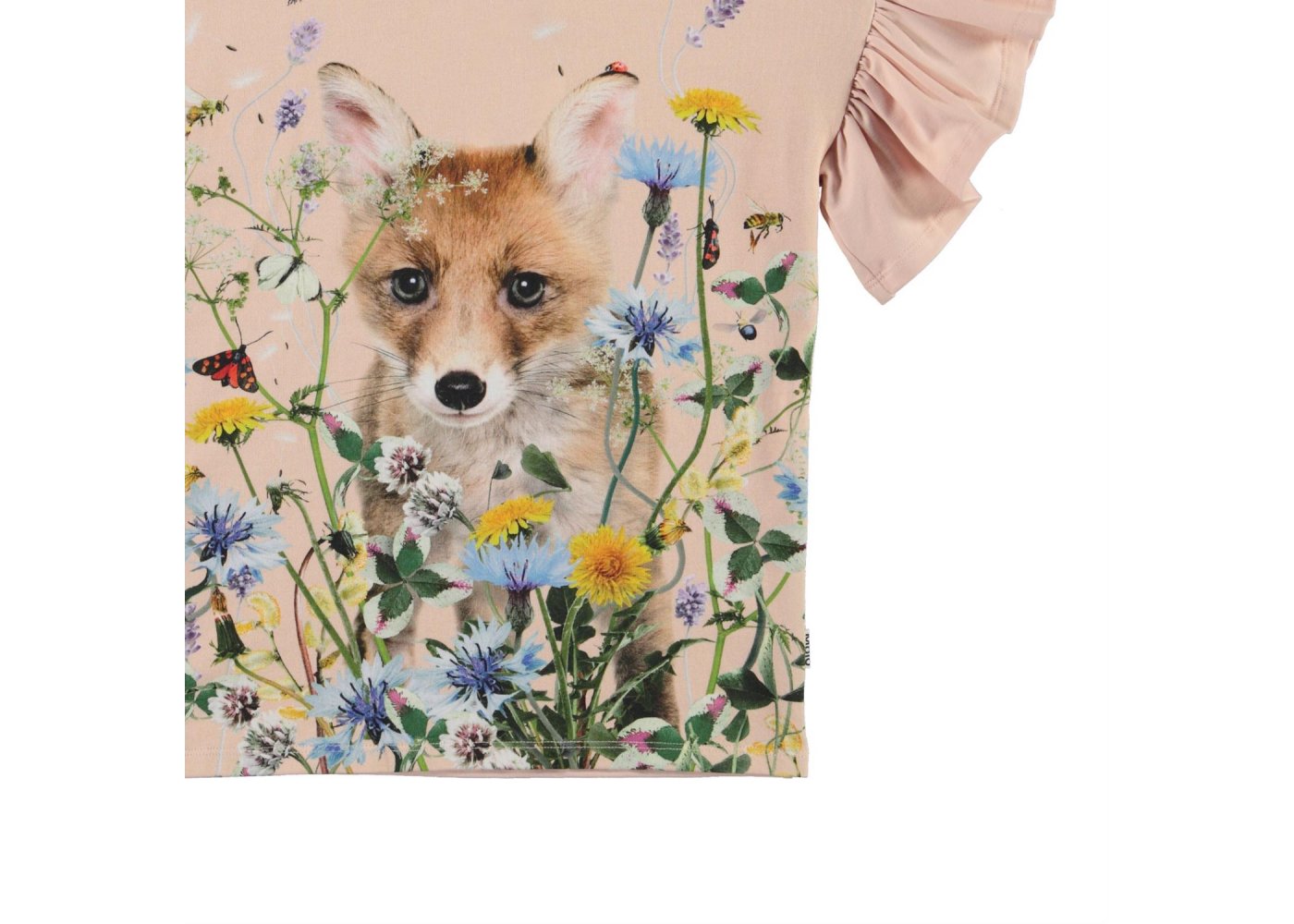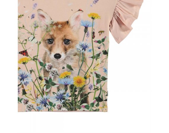 T-shirten har et print foran med en ræv, der gemmer sig i en blomstereng. T-shirten er ensfarvet bagpå. En bluse der er rigtig flot at style til festlig brug.