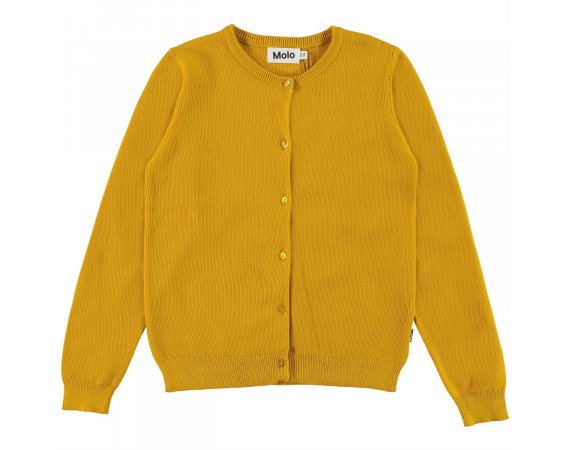 Lækker gylden gul cardigan i økologisk bomuld fra Molo.Georgina cardigan har rib i alle åbninger og lukkes foran med flotte små knapper.