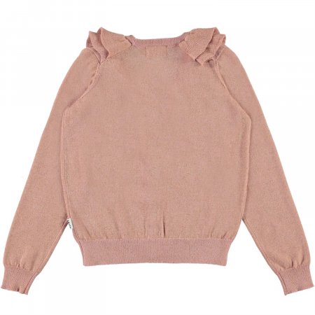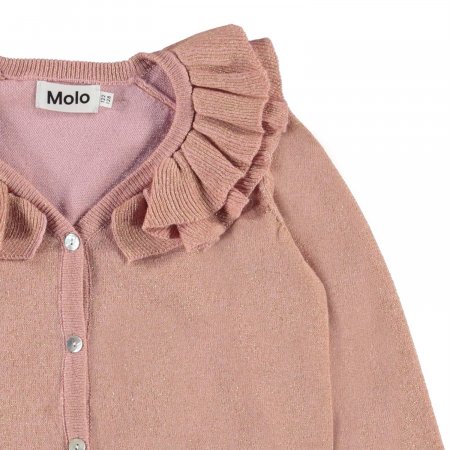 Super yndig og lækker rosa strik cardigan med glimmer fra Molo.Gerdis cardigan har en flot flæsekrave og lukkes med fine perlemors knapper foran.