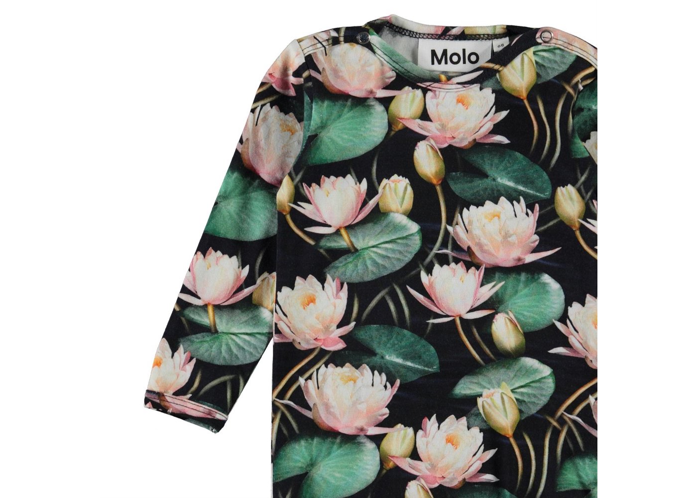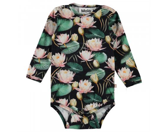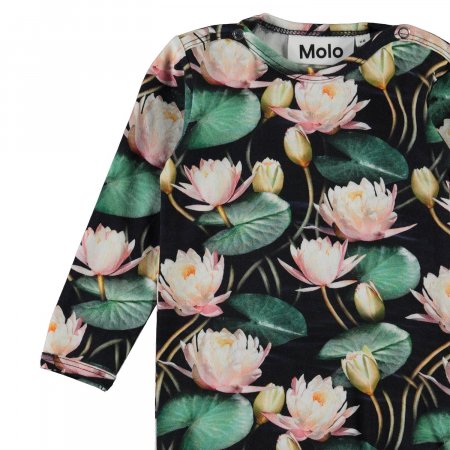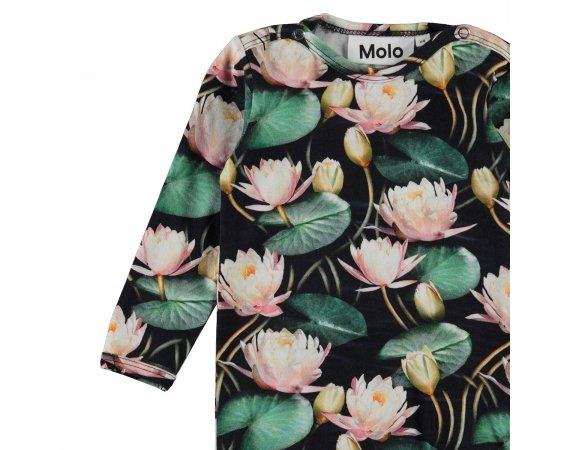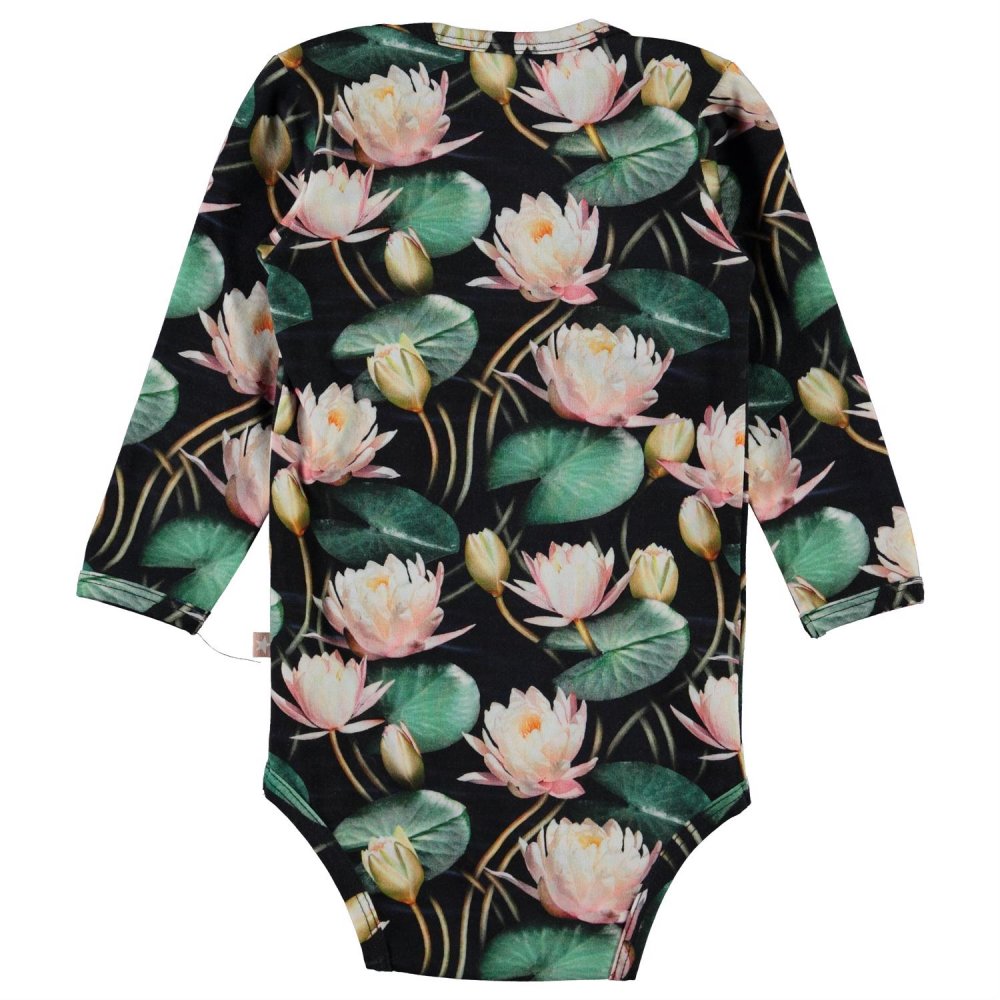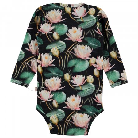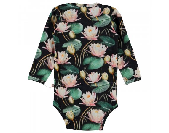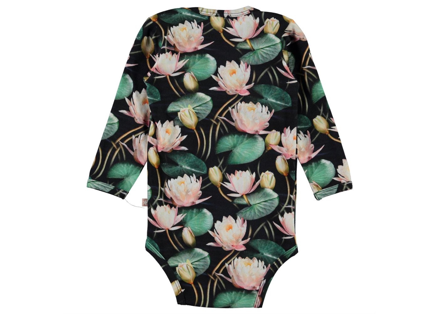 Sød langærmet sort body med print af grønne åkander med smukke rosa og gule blomster fra Molo.