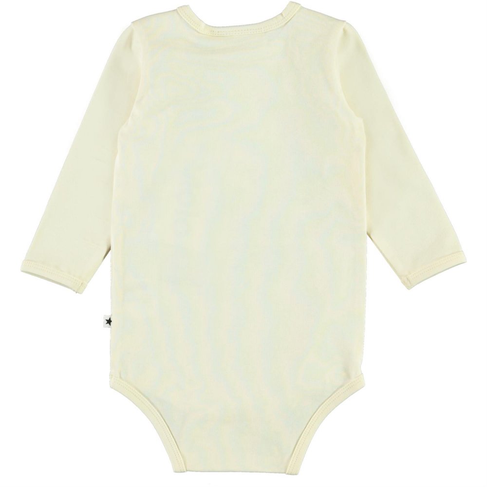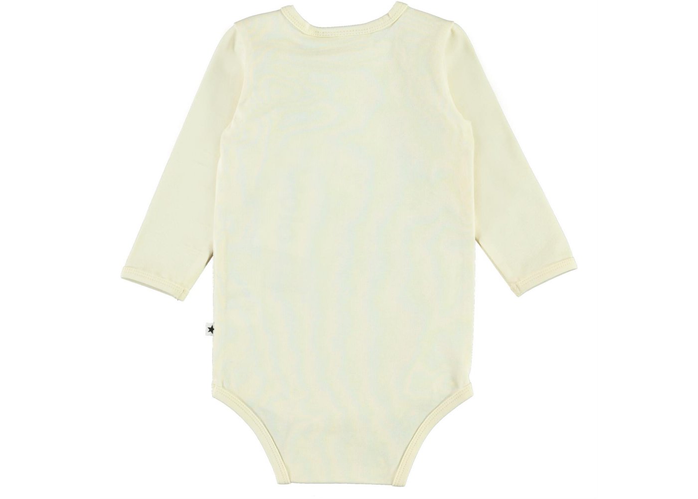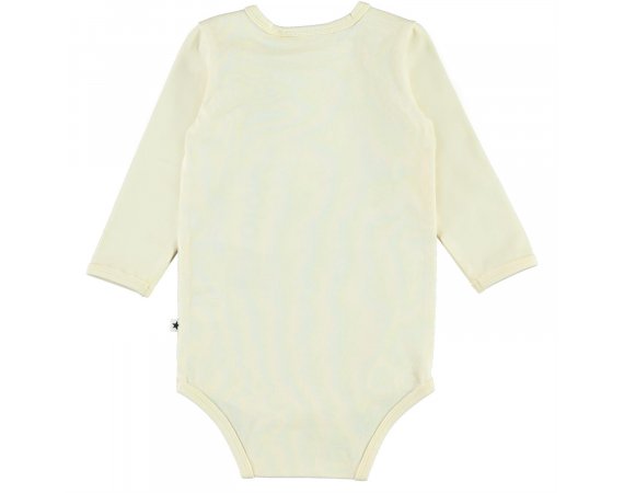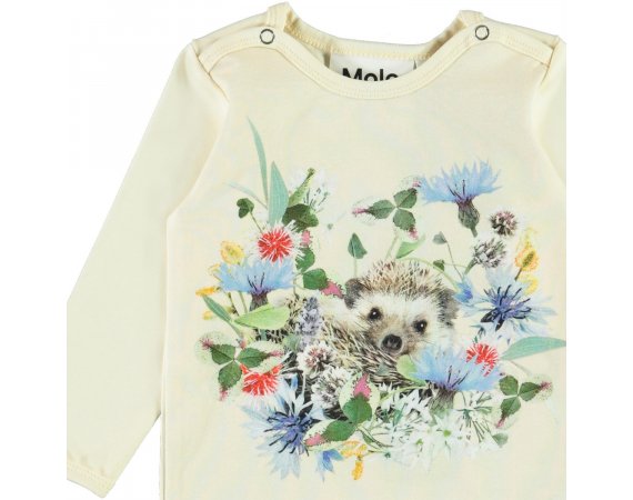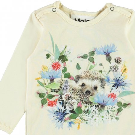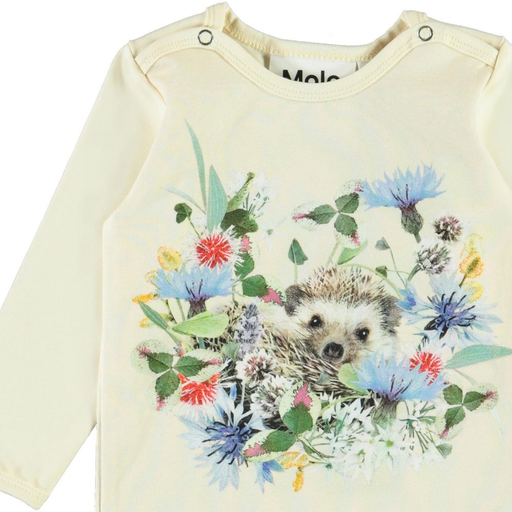 Sød langærmet beige body fra Molo med print af et lille pindsvin der hygger sig i en blomstereng.