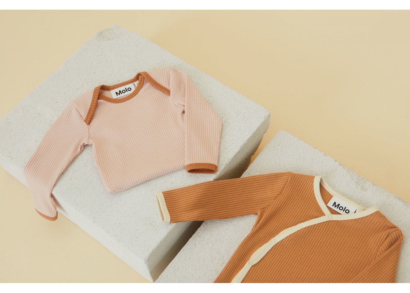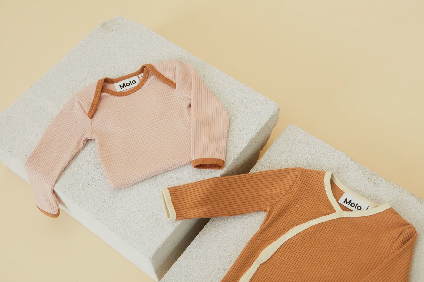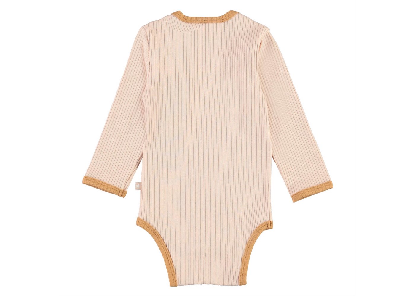 Super sød rib body i rosa med beige-brune ribkanter fra Molo.