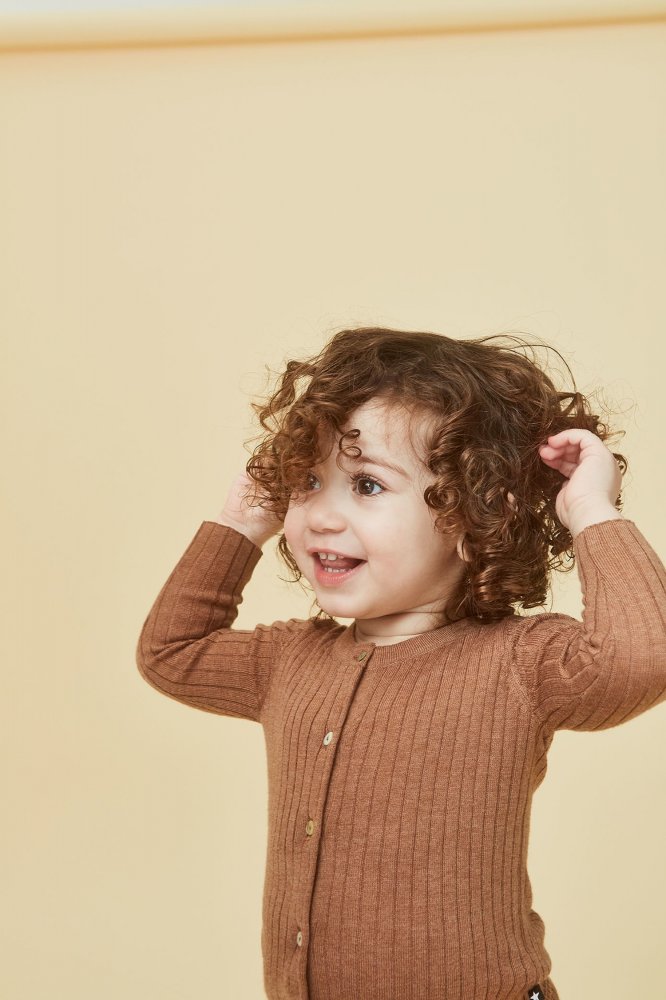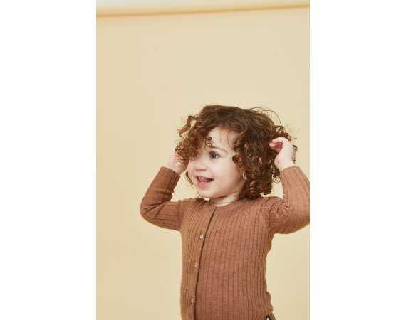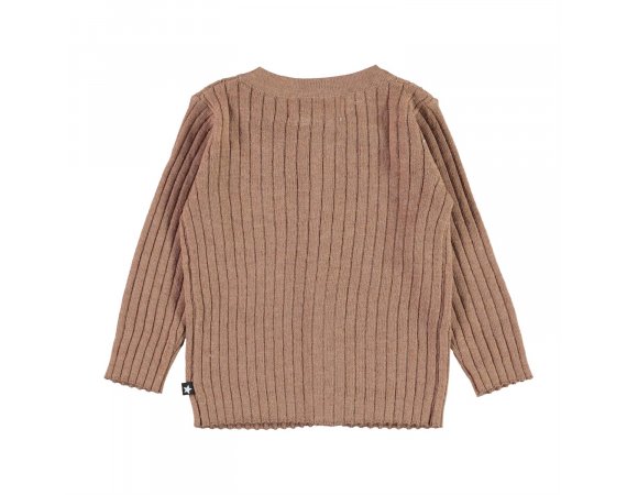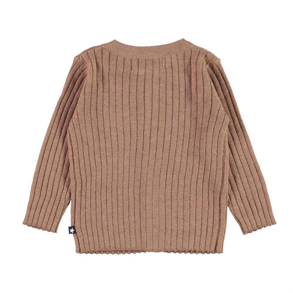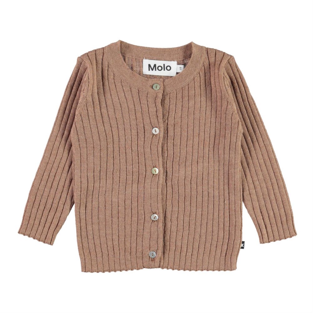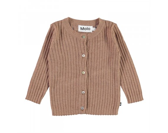 Yndig og lækker lysebrun cardigan i ribstrik fra Molo.Trøjen lukkes med fine knapper ned foran.En fin cardigan der kan bruges til næsten alt, pynte og give dejlig varme.