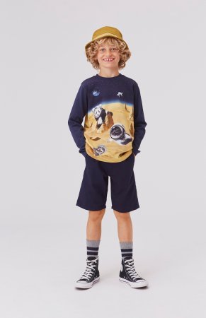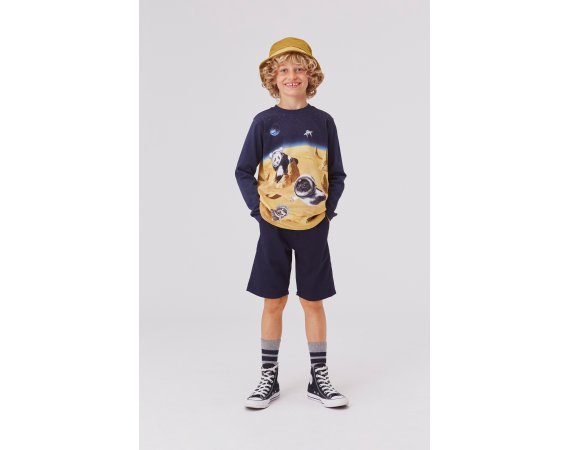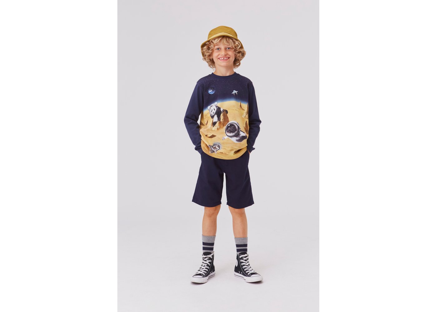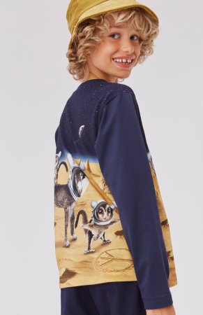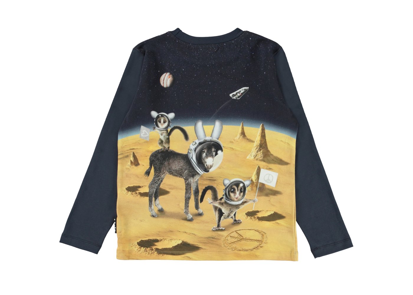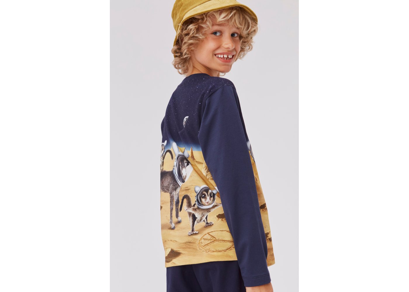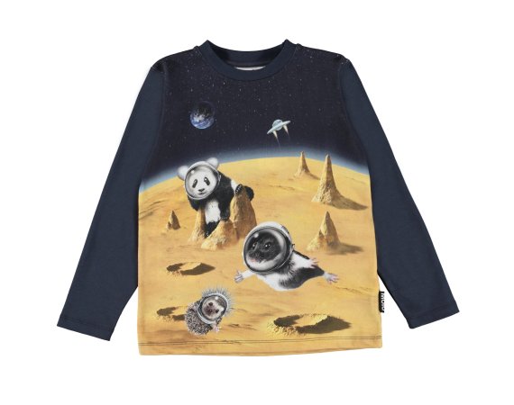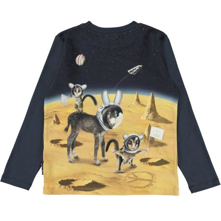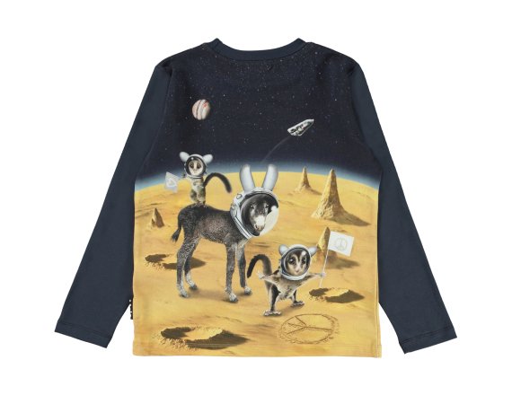 T-shirten har ensfarvede blå ærmer og seje dyr i rumdragter både foran og bagpå.