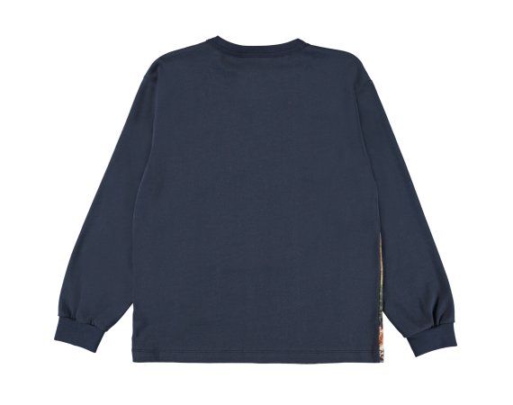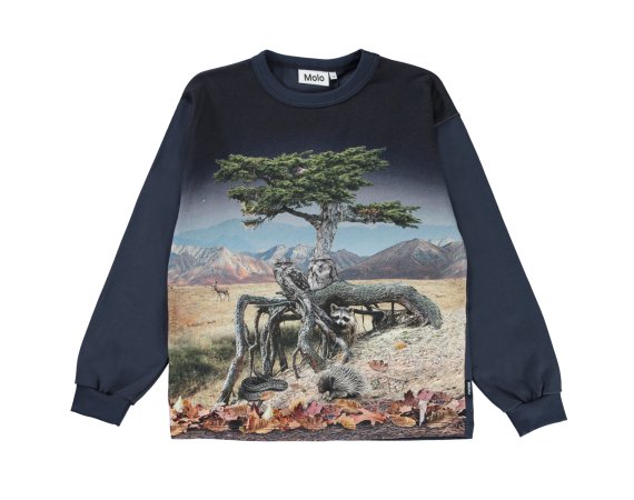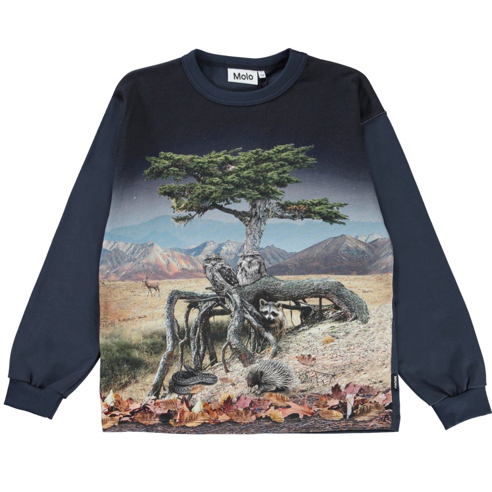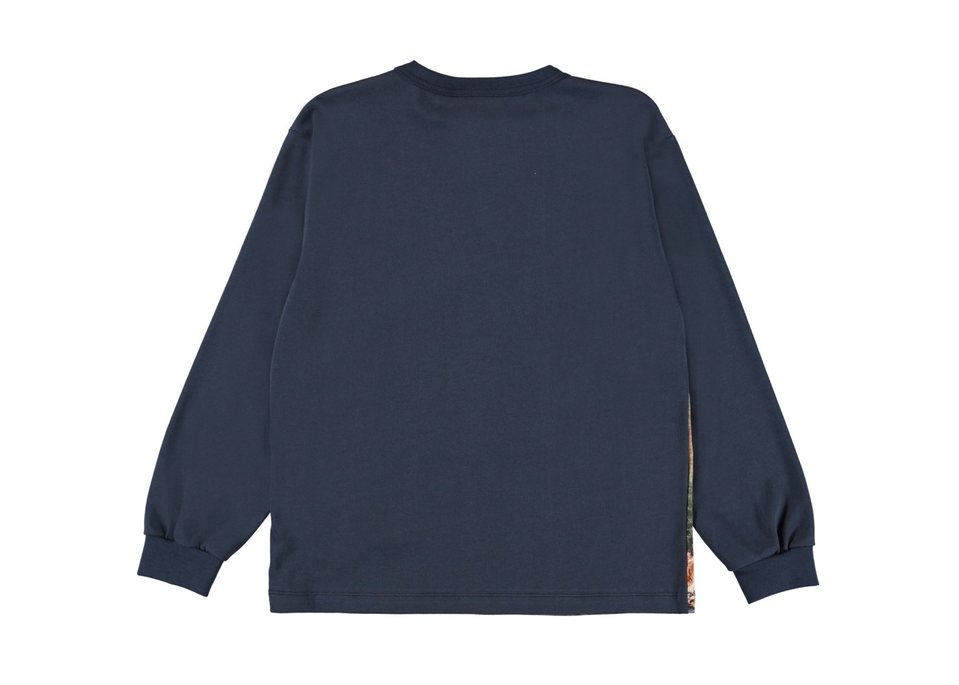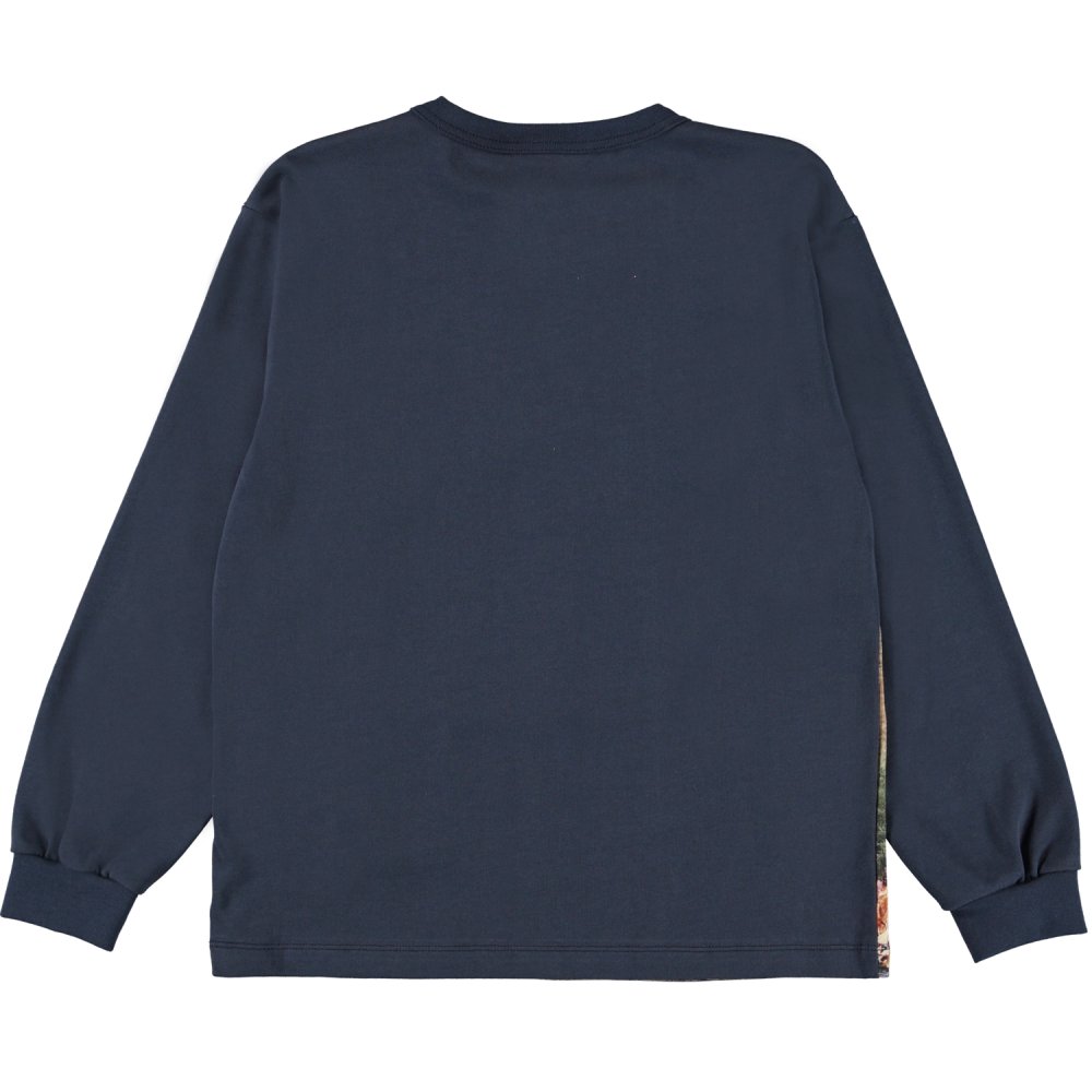 T-shirten har ensfarvede blå ærmer og et flot print med dyr foran. Den er ensfarvet bagpå.