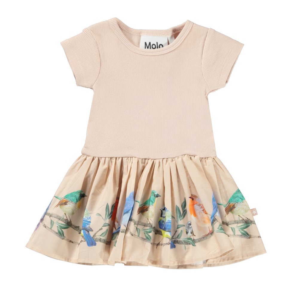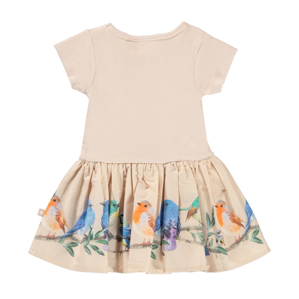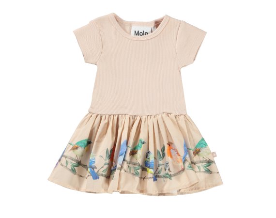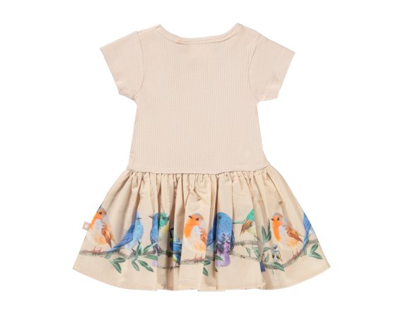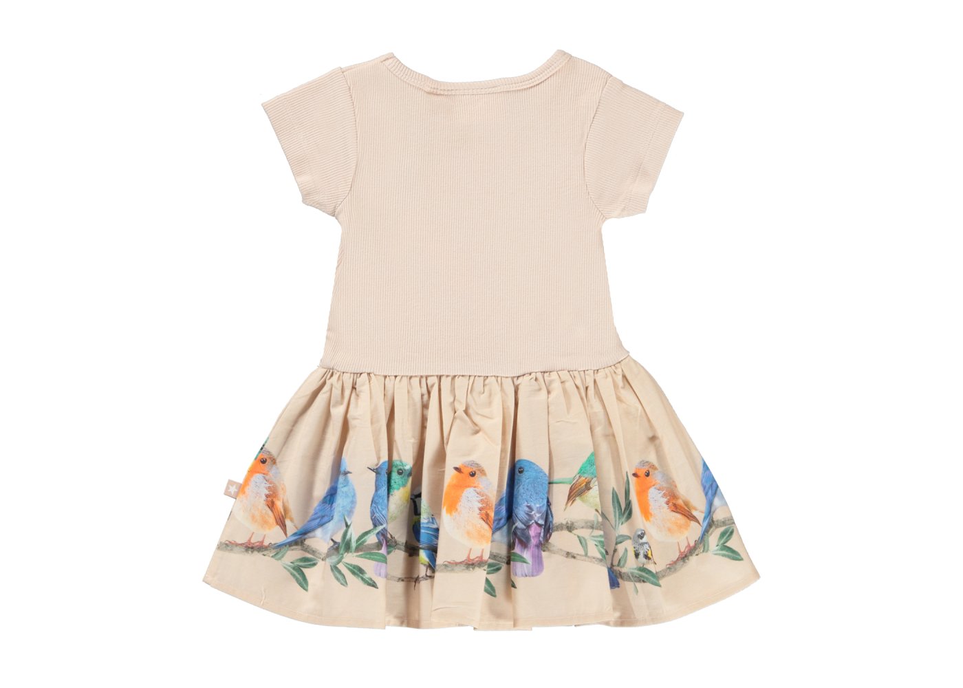 Skøn todelt kjole med korte ærmer og rynket skørt med flot fugleprint.