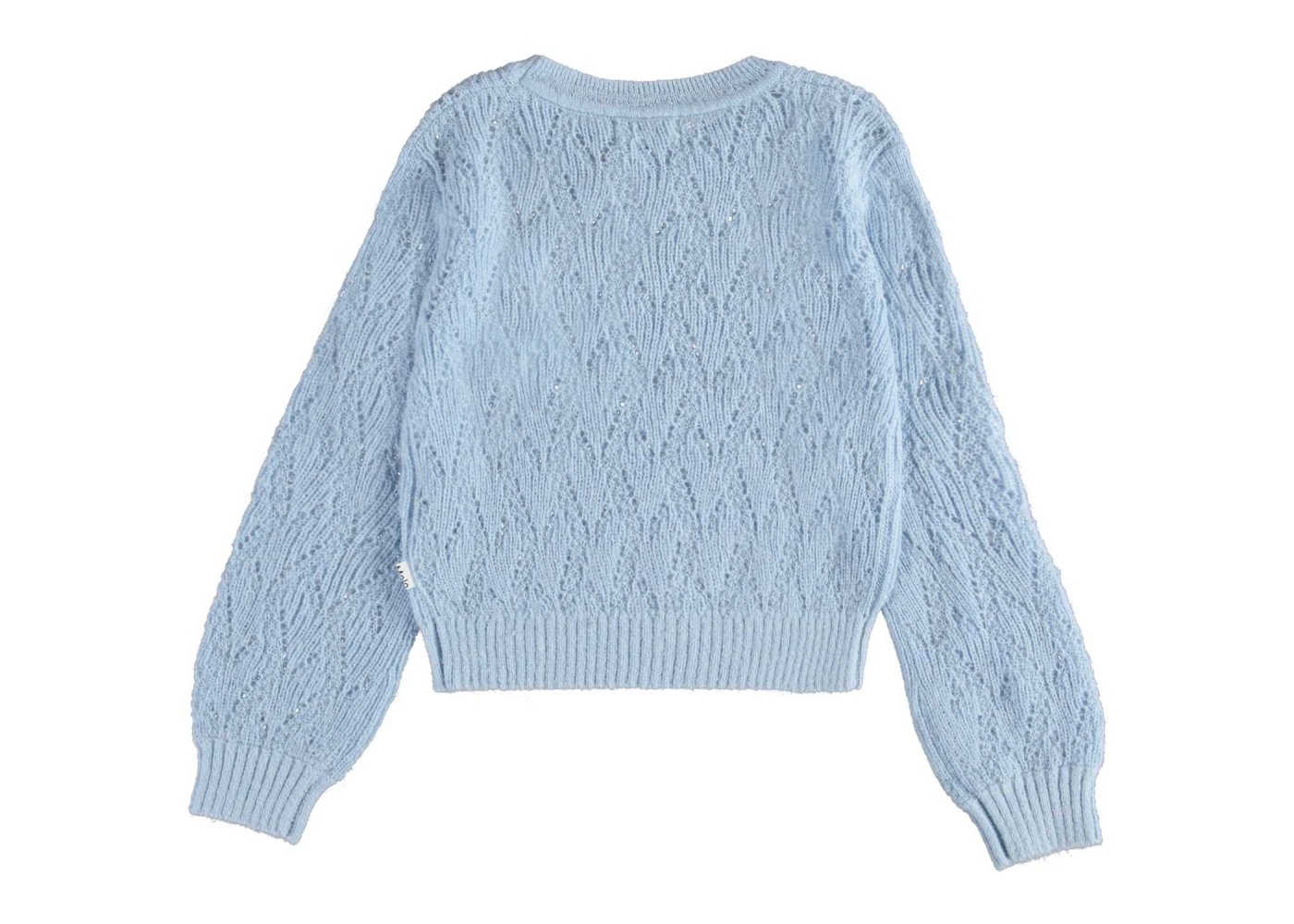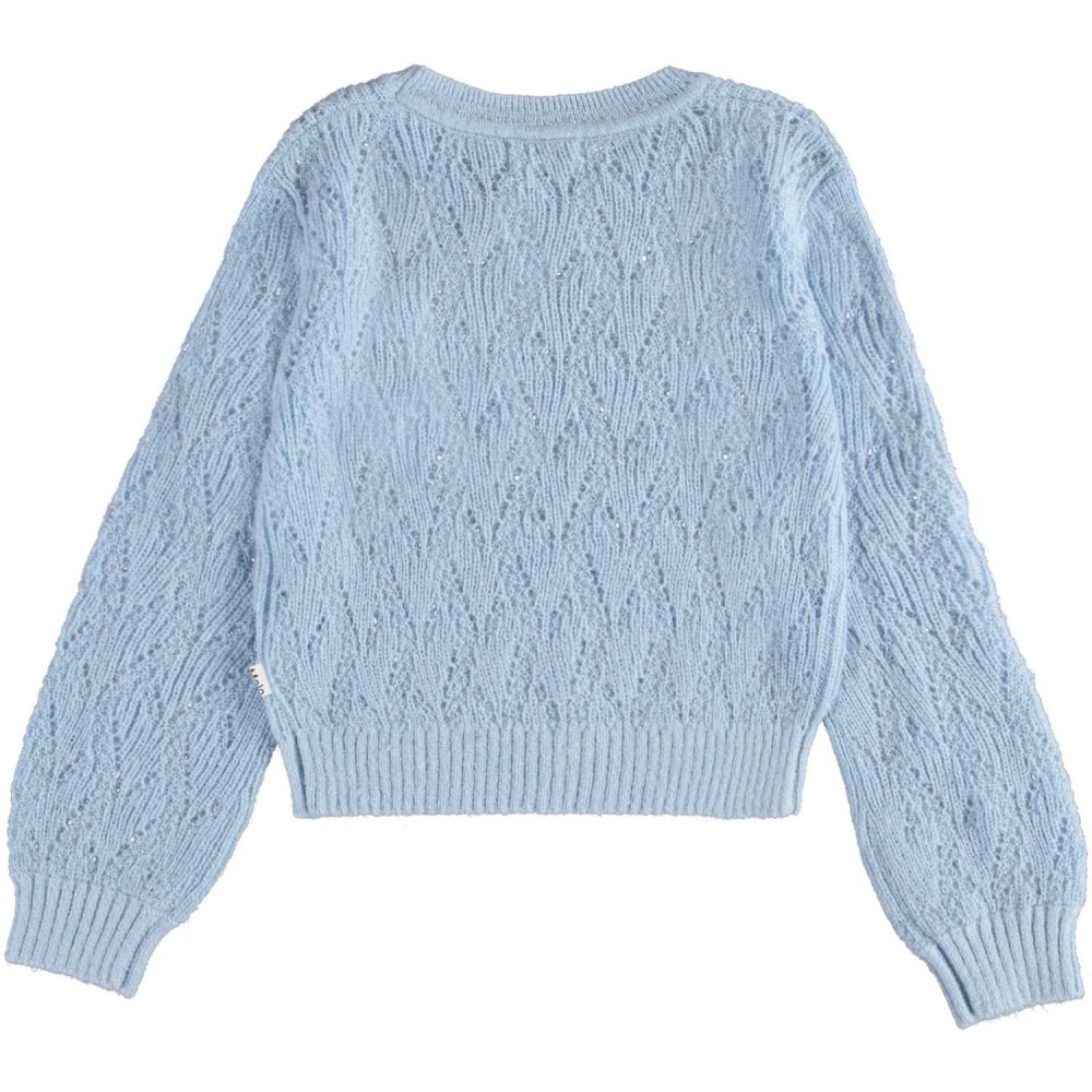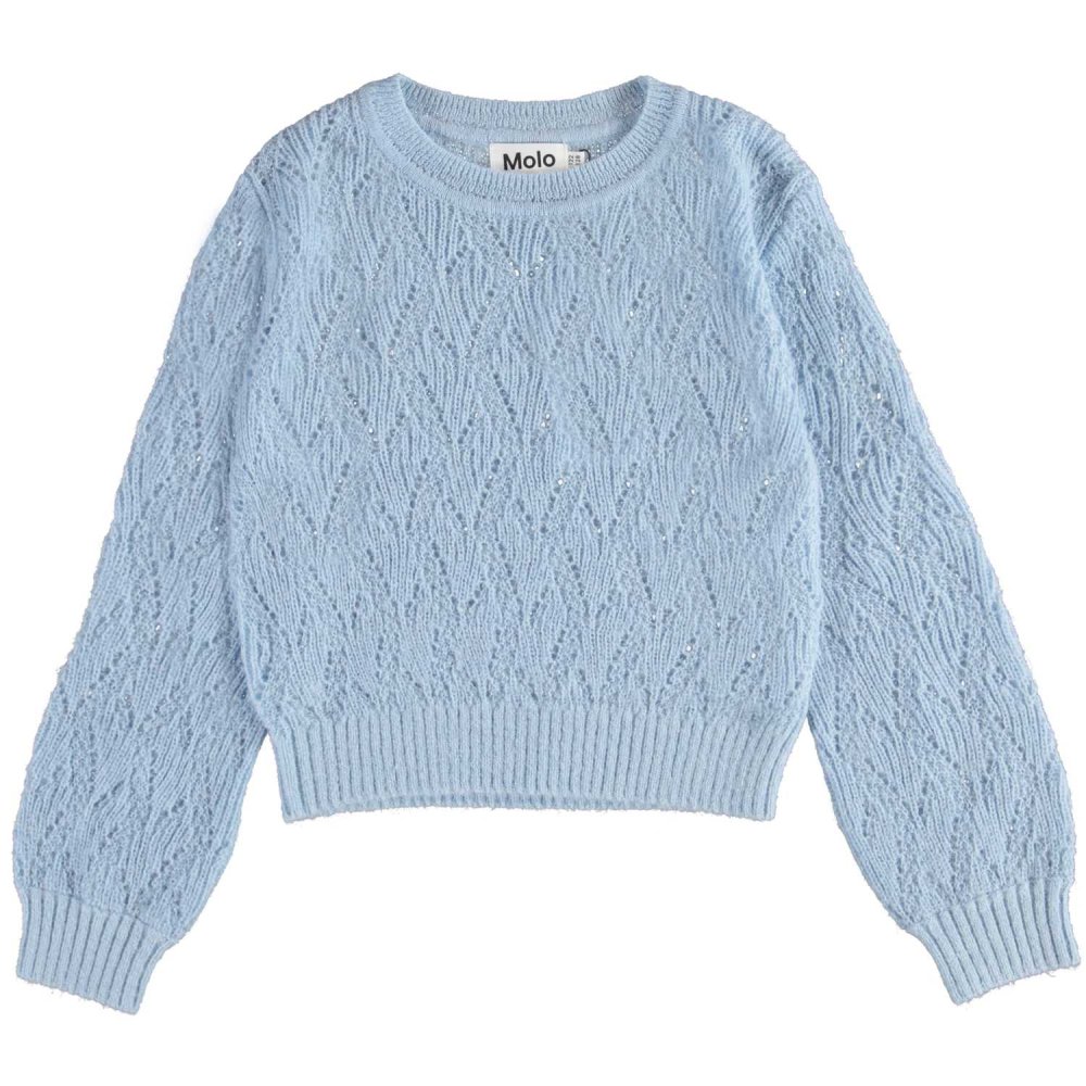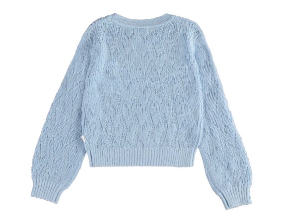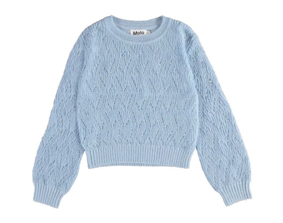 Molo pullover i blå med flot strikmønster.Pulloveren har ribkanter i alle åbninger.Uld er lækkert, da det kan varme, når det er koldt, og køle når det er varmt.