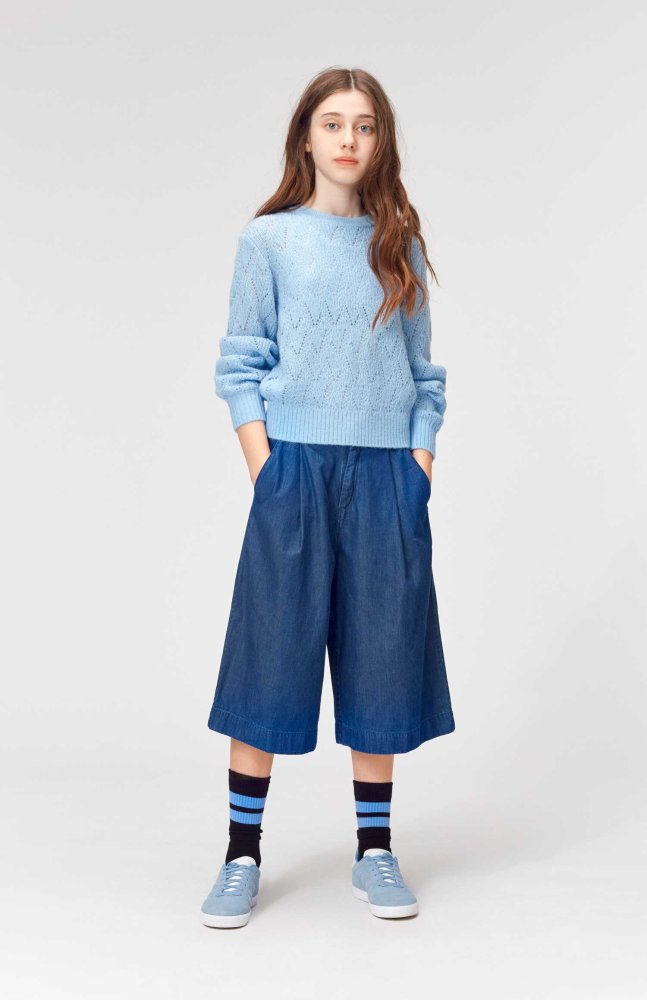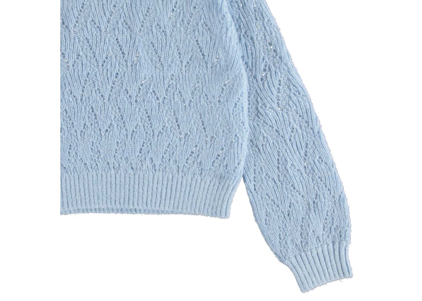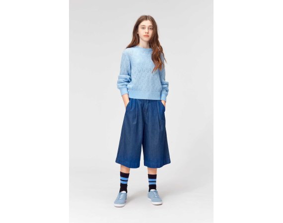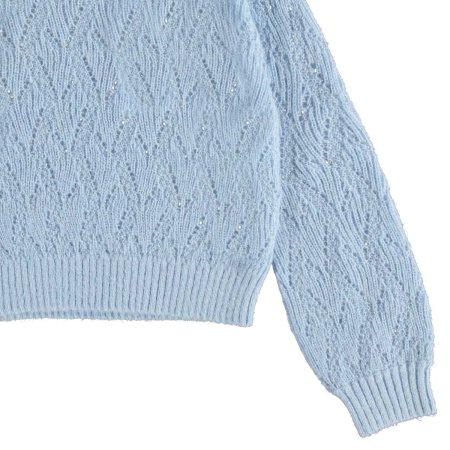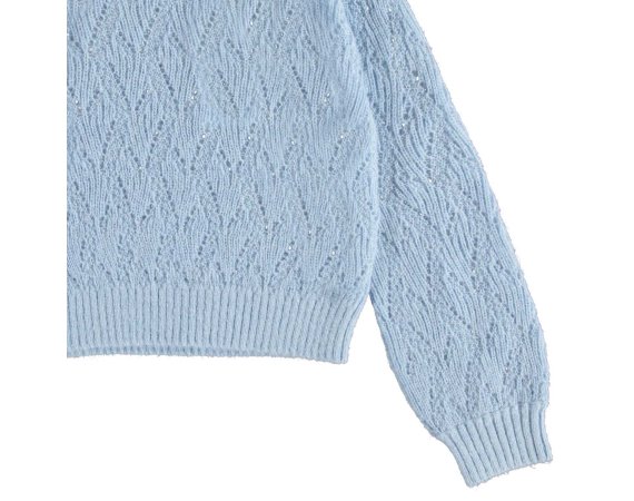 Molo pullover i blå med flot strikmønster.Pulloveren har ribkanter i alle åbninger.Uld er lækkert, da det kan varme, når det er koldt, og køle når det er varmt.