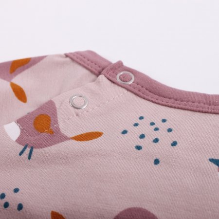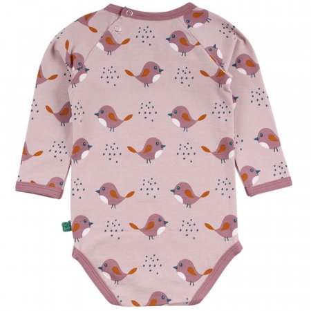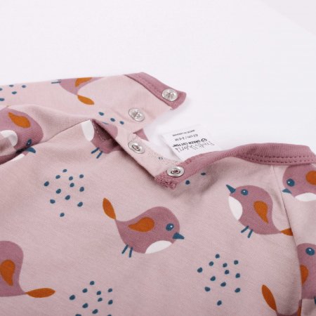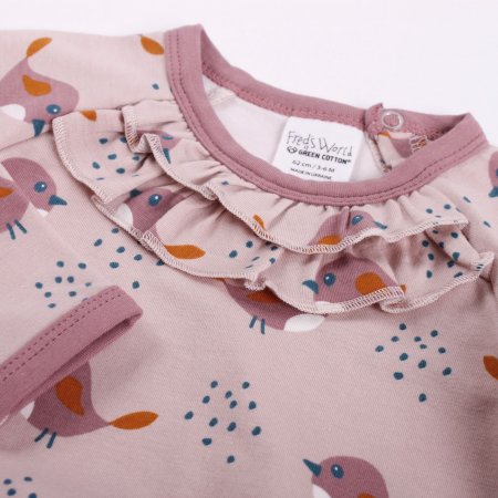 Langærmet body i blød strækbar kvalitetSød body med fugle og flæsekanter foran på brystet.