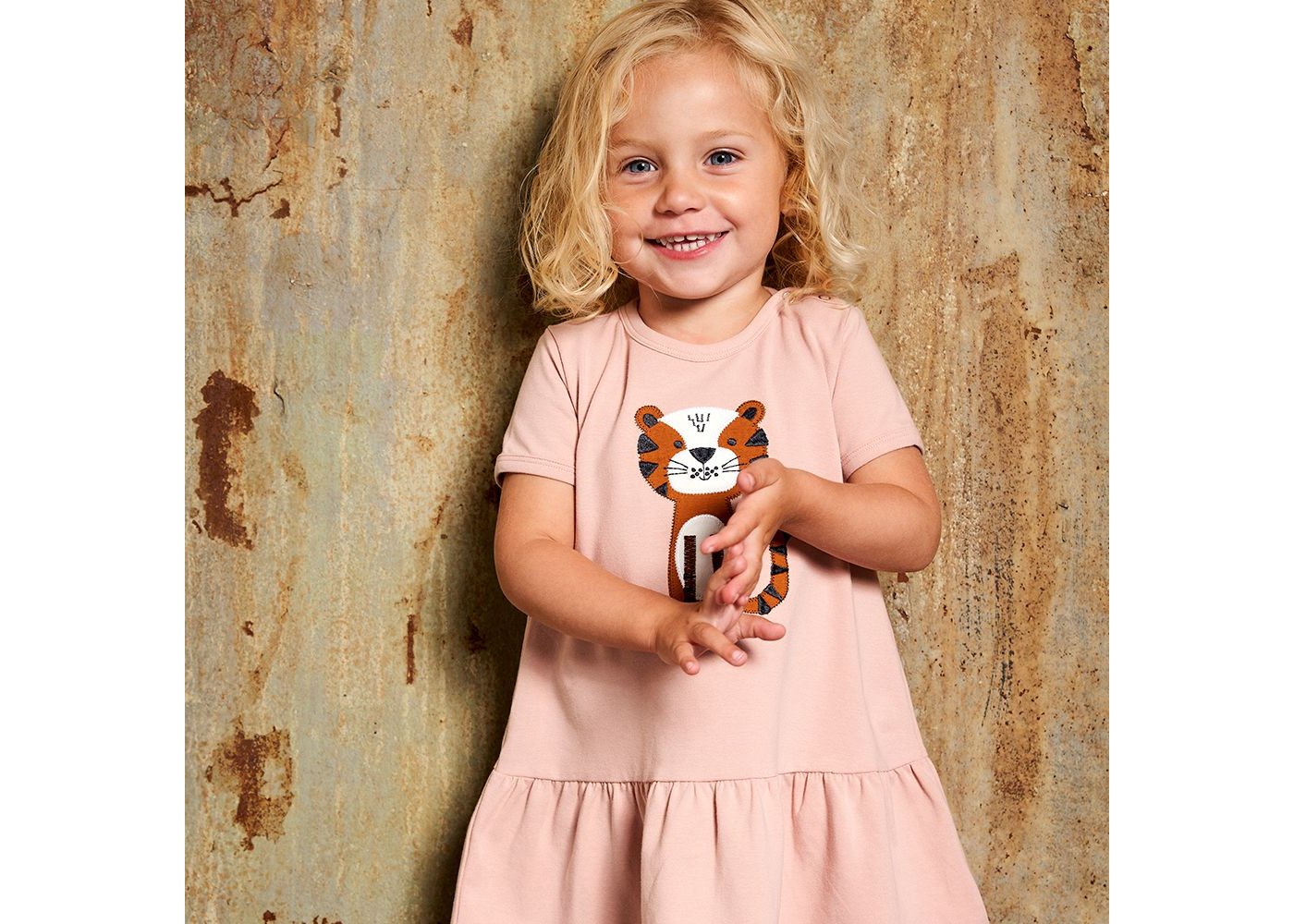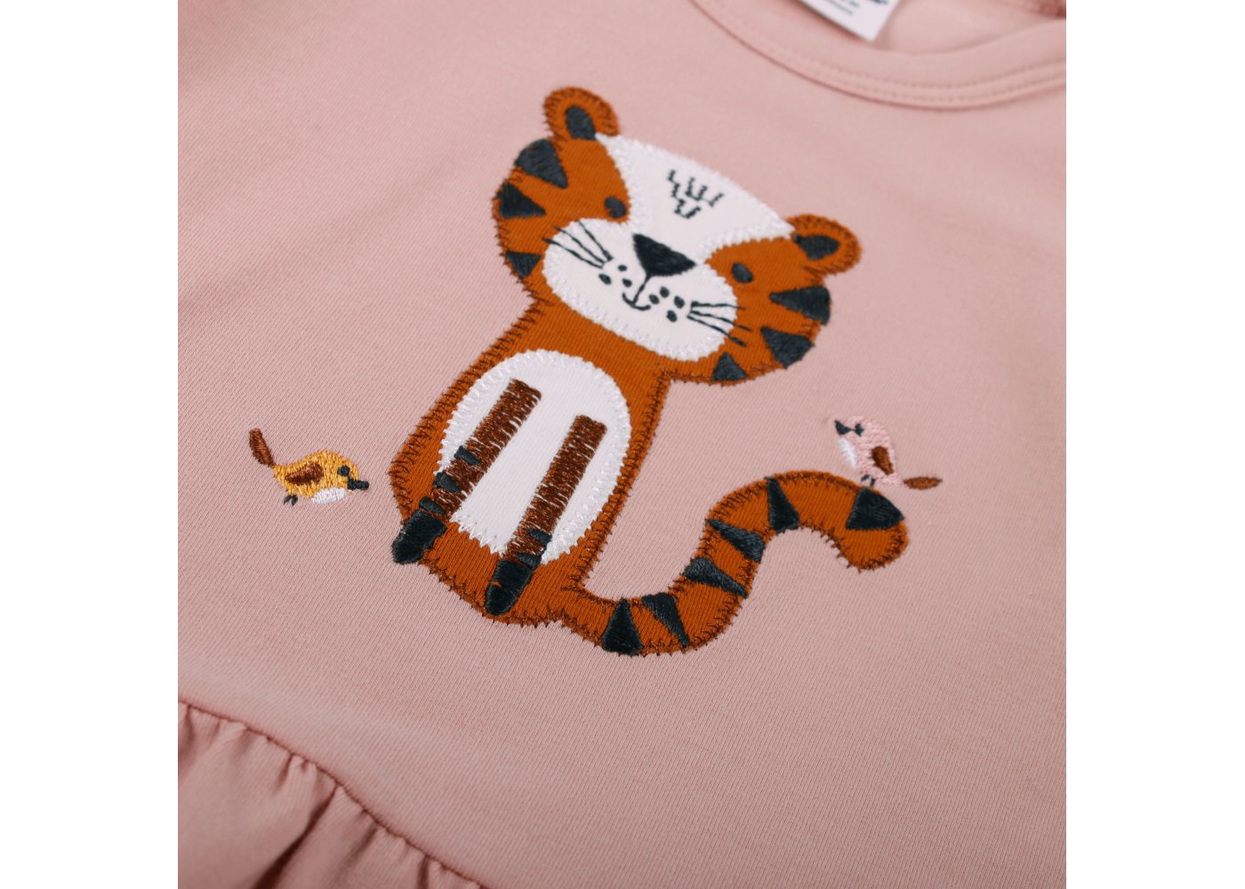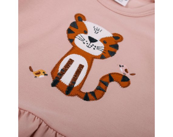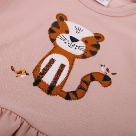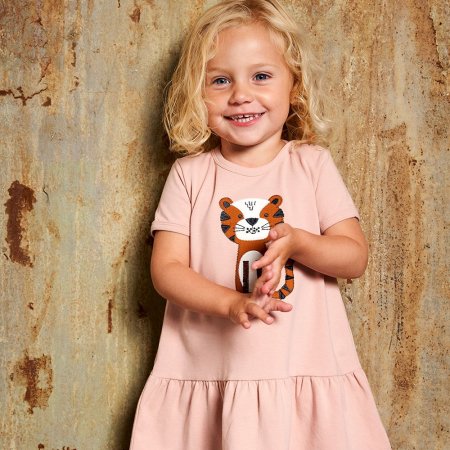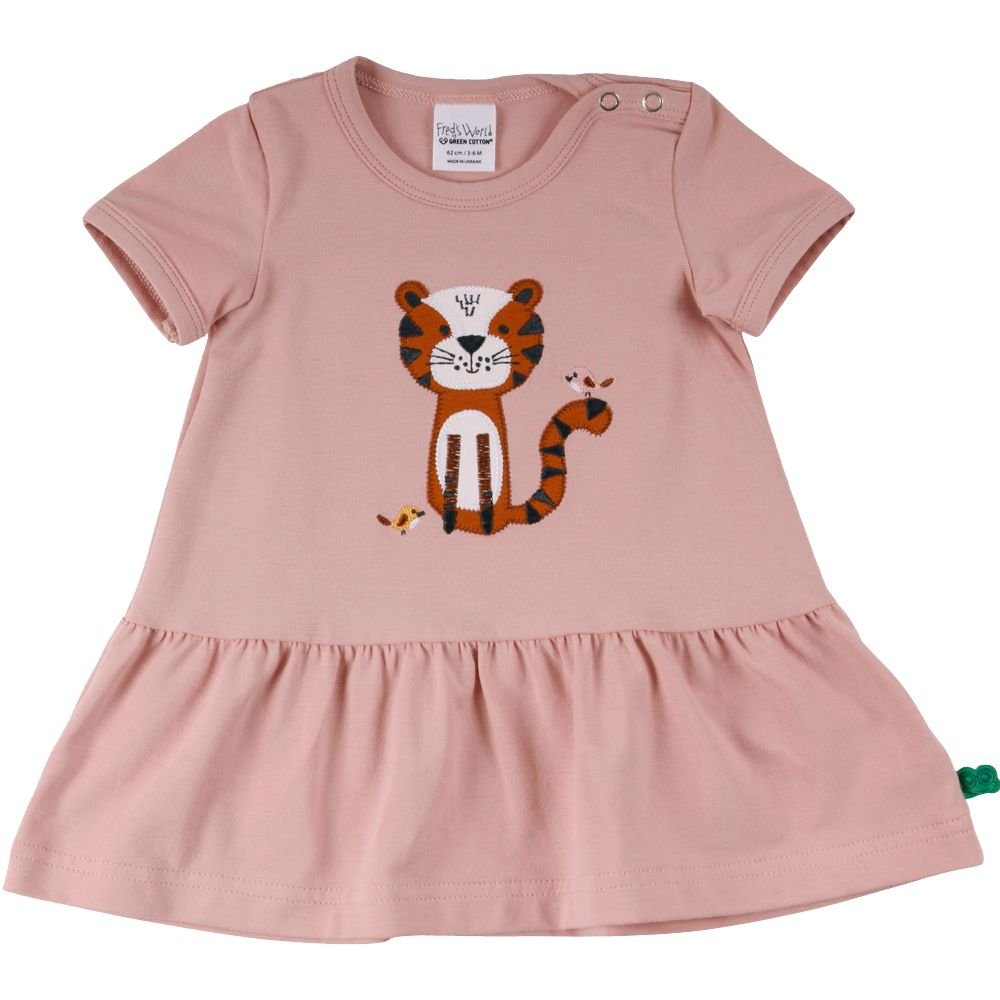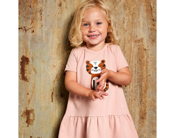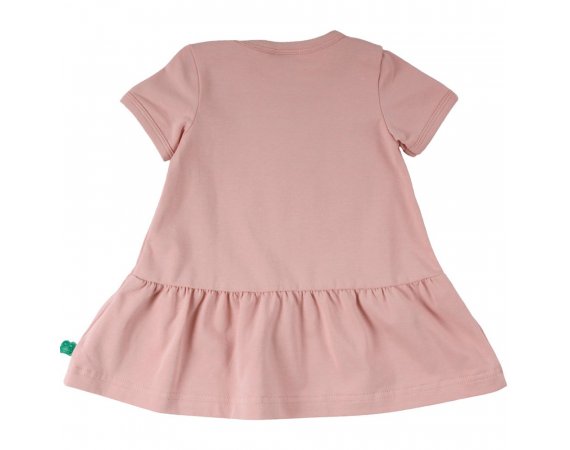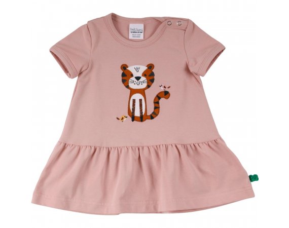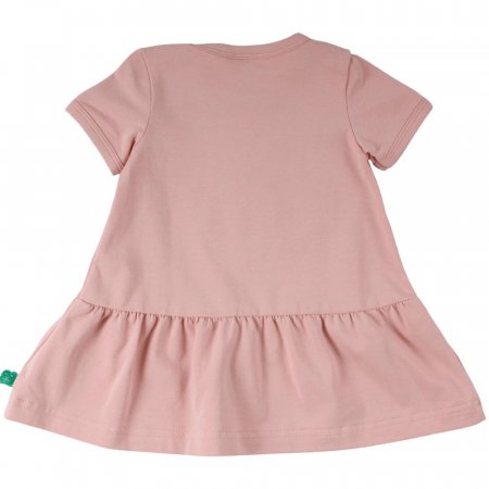 Fin kjole med korte ærmer til forår og sommerbrug.Kjolen har et sødt, broderet kattemotiv med små fugle foran. Den har et flot rynket skørt og lukkes med trykknapper på venstre skulder. Kjolen er fremstillet i en lækker, blød og strækbar bomuldskvalitet, der gør den behagelig at have på.Tekstil: 95 % økologisk bomuld, 5 % elastan