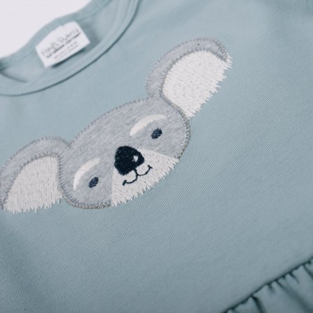 Fin kjole med korte ærmer til forår og sommerbrug.Kjolen har et sødt, broderet koala hoved foran. Den har et flot rynket skørt og lukkes med trykknapper på venstre skulder. Kjolen er fremstillet i en lækker, blød og strækbar bomuldskvalitet, der gør den behagelig at have på.Tekstil: 95 % økologisk bomuld, 5 % elastan