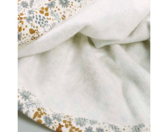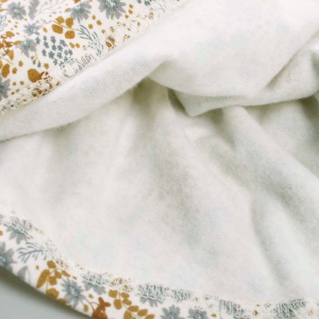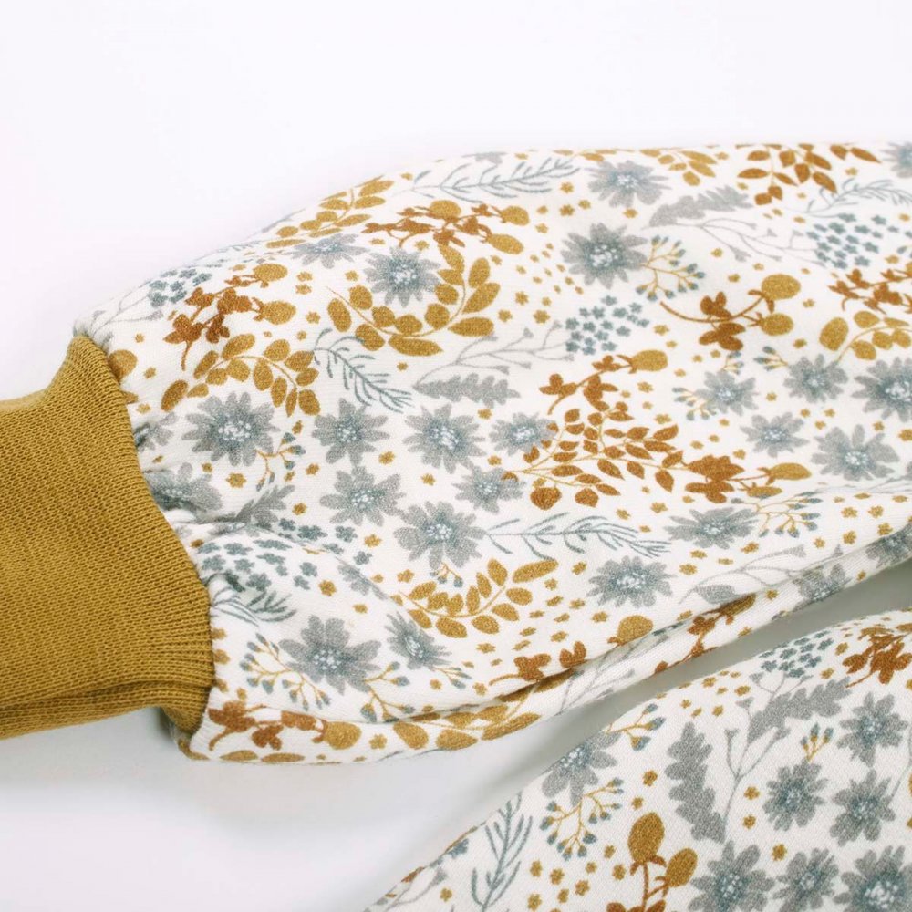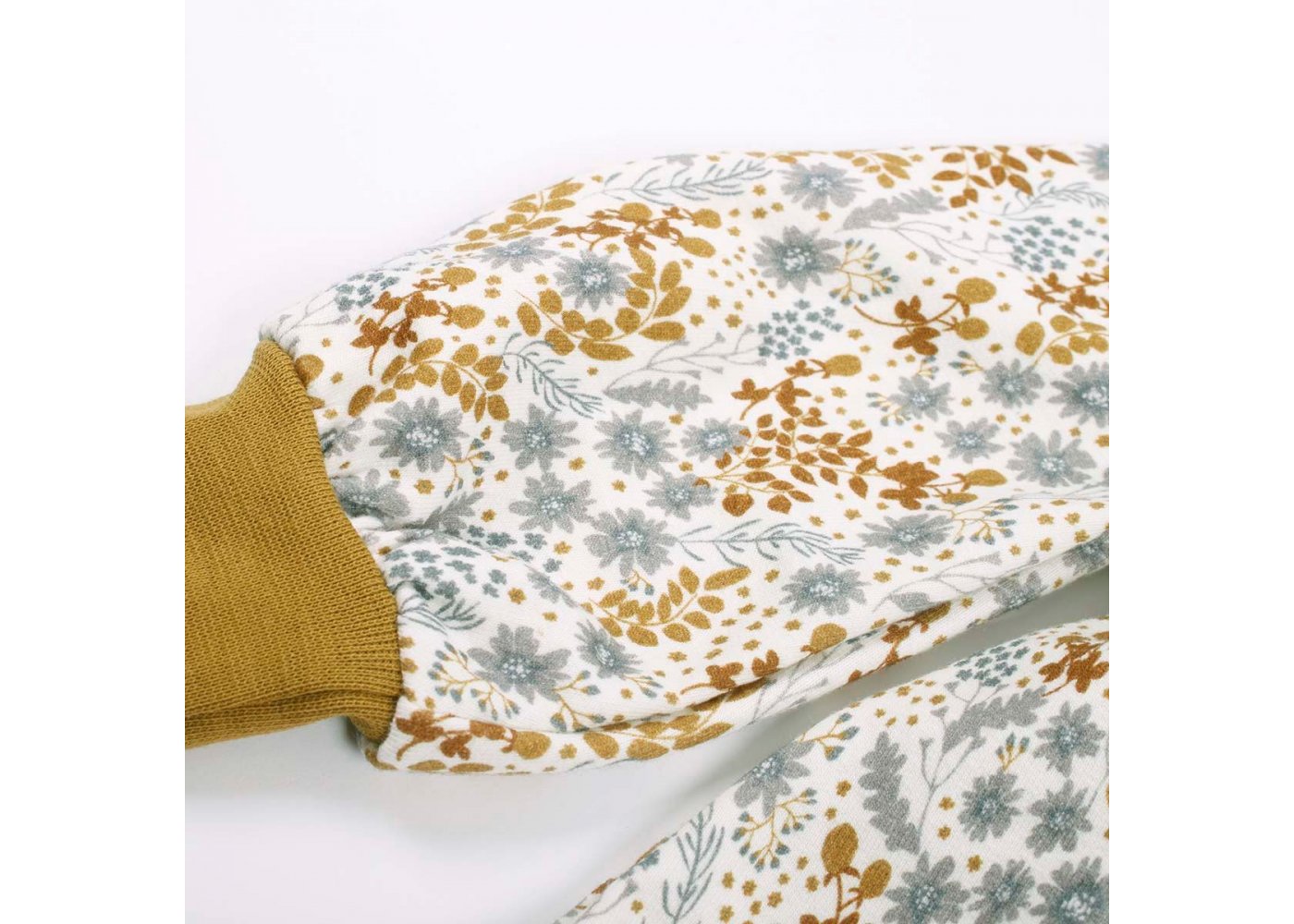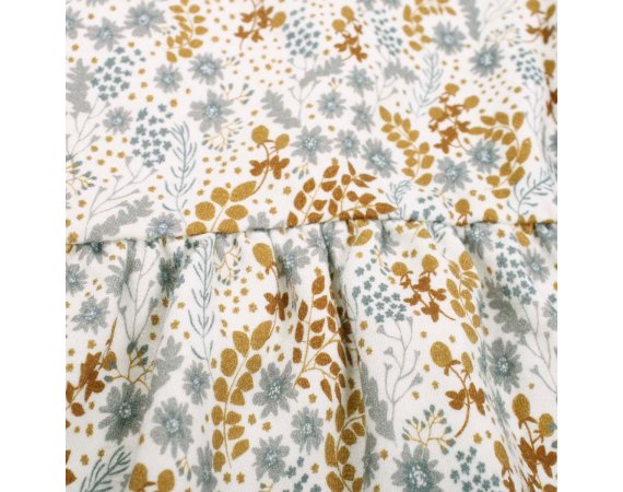 Smuk hvid kjole med blomster og grene i smørgule og grå nuancer til en sød lille pige.