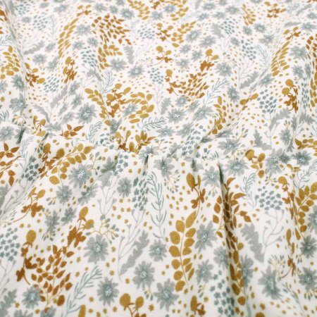 Smuk knælang hvid kjole med blomster og grene i smørgule og grå nuancer.