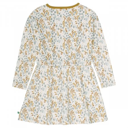 Kjolen har en smal ribkant i halsudskæring i en flot gul farve, der matcher blomsterne på kjolen. Kjolen har elastik og rynket skørt med fin vidde i livet.