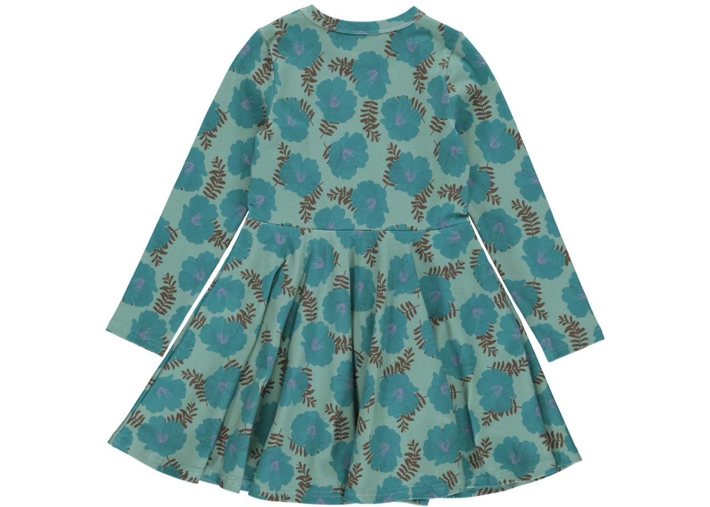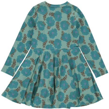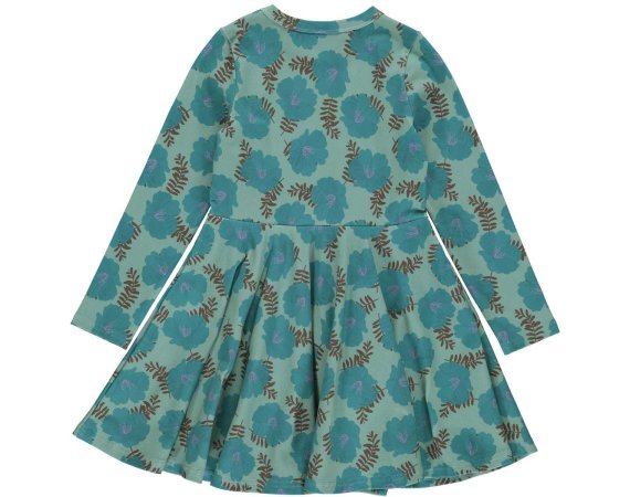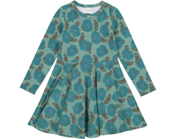 Kjolen har en smal ribkant i halsudskæring, og et skørt syet som en halvcirkel, der give den flot fylde og vidde.
