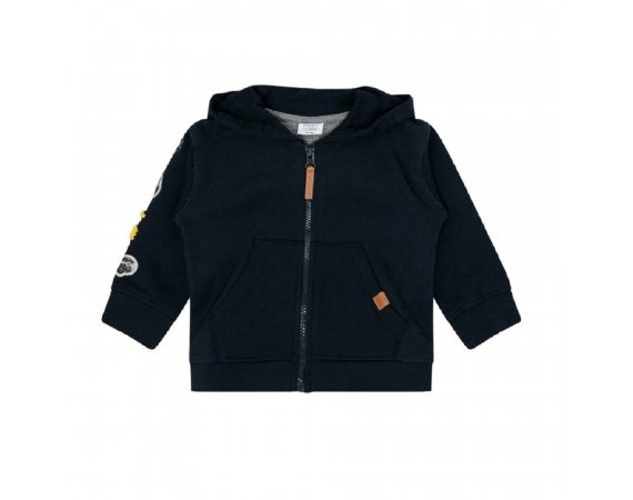 Cardigannen er mørkeblå, har en hætte og en kraftig lynlås midt for foran, samt forskellige motiver på højre ærme.