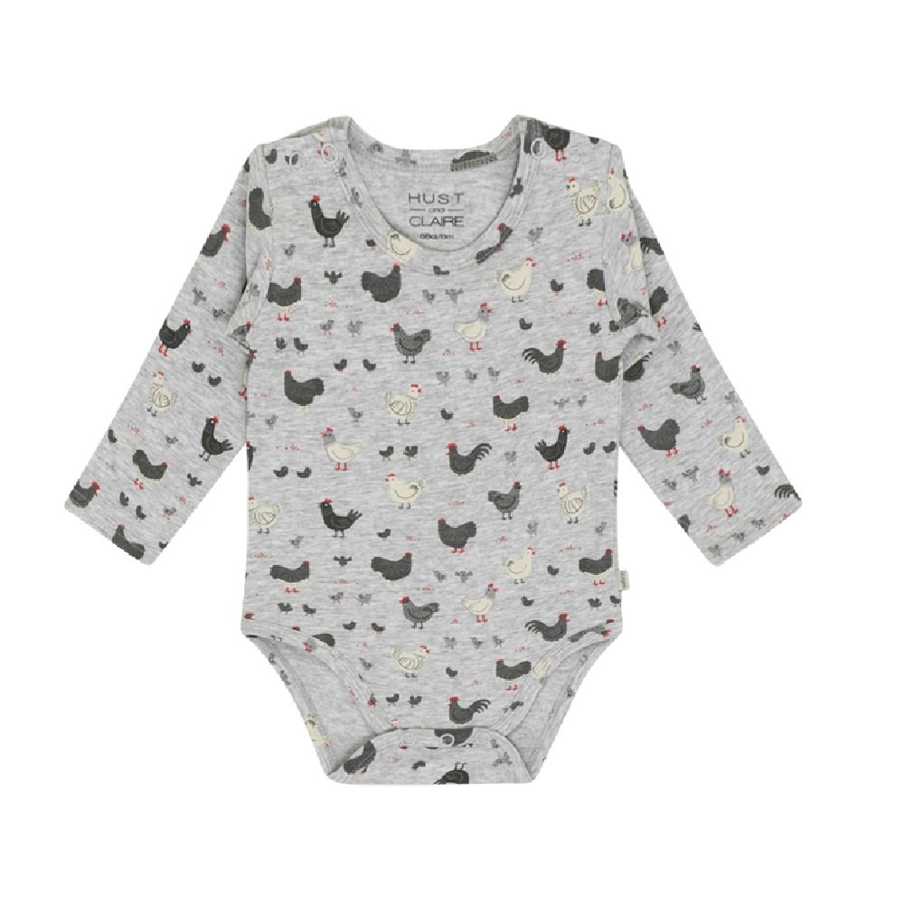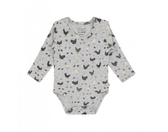 Langærmet bodystocking med et sødt print af høns. Modellen lukkes med trykknapper ved halsen og mellem benene.