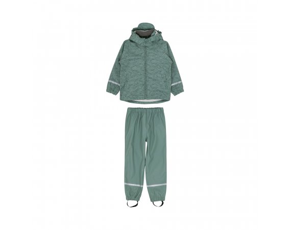 Regntøj bestående af regnjakke og -bukser. Jakken er med aftagelig hætte, lommer fortil og åbnes med lynlås midt for. Bukserne er uden print, men i matchende farve, og har elastik i taljen. ærmer og bukseben er beklædt med en refleksstribe.