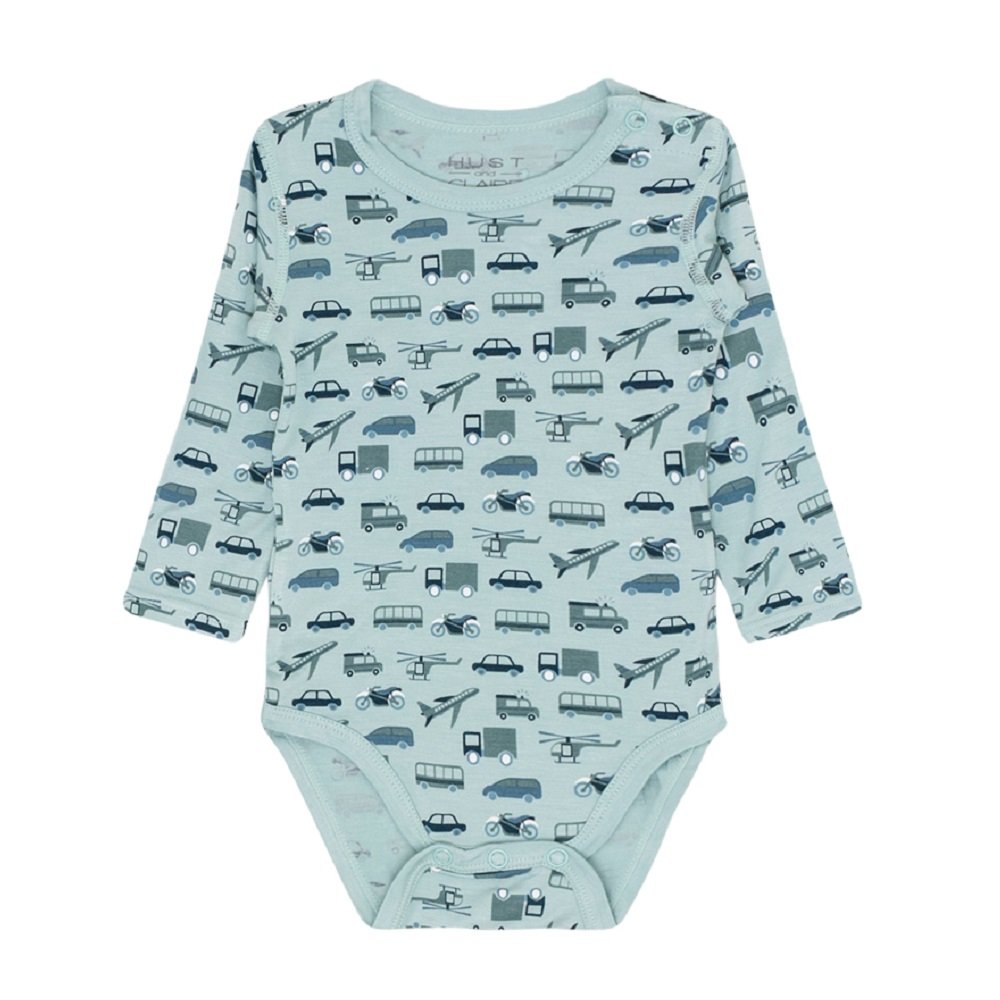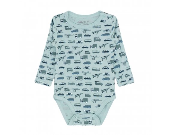 Langærmet bodystocking i stretchy bambusjersey med print af biler, helikoptere, fly og motorcykler.Materialet i denne body gør den super velegnet til bla. nattøj.