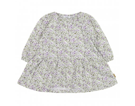 Kjole i en behagelig viskose med blomsterprint. Modellen har en sød sløjfe i halsen og en lav talje med rynk og vidde i skørtet.