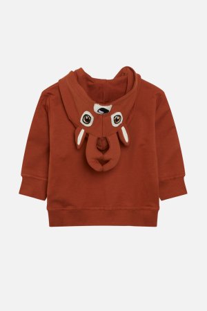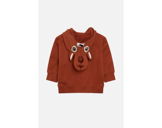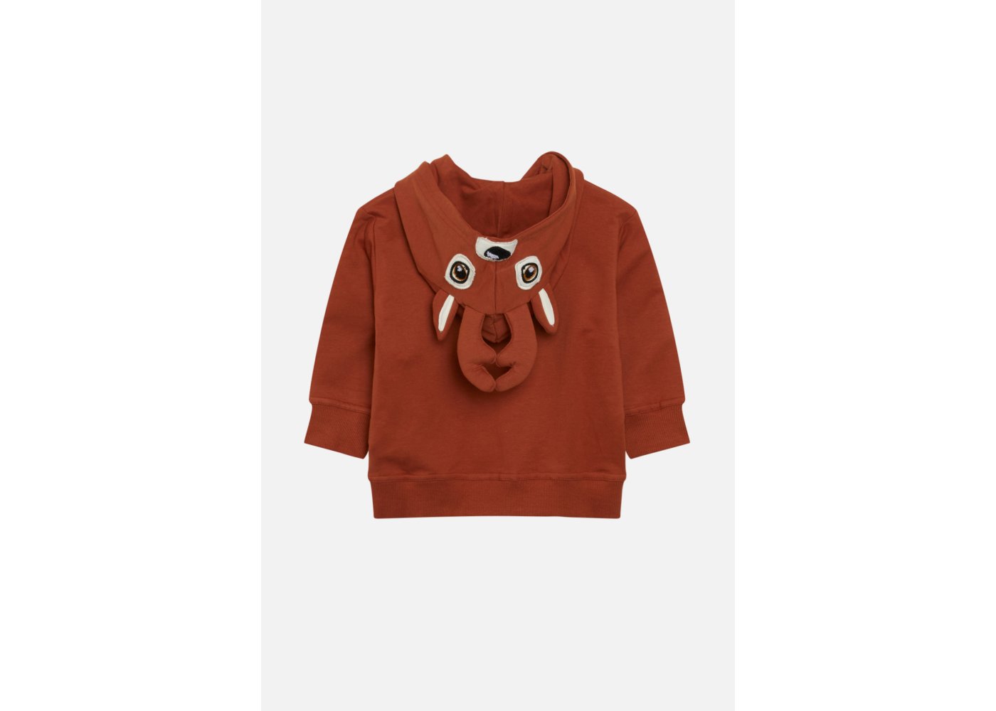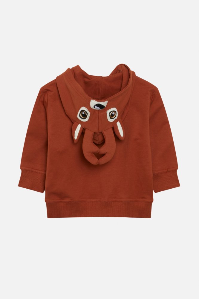 Trøjen har rensdyr hoved på hætte og bred ribkant i ærmer og liv.