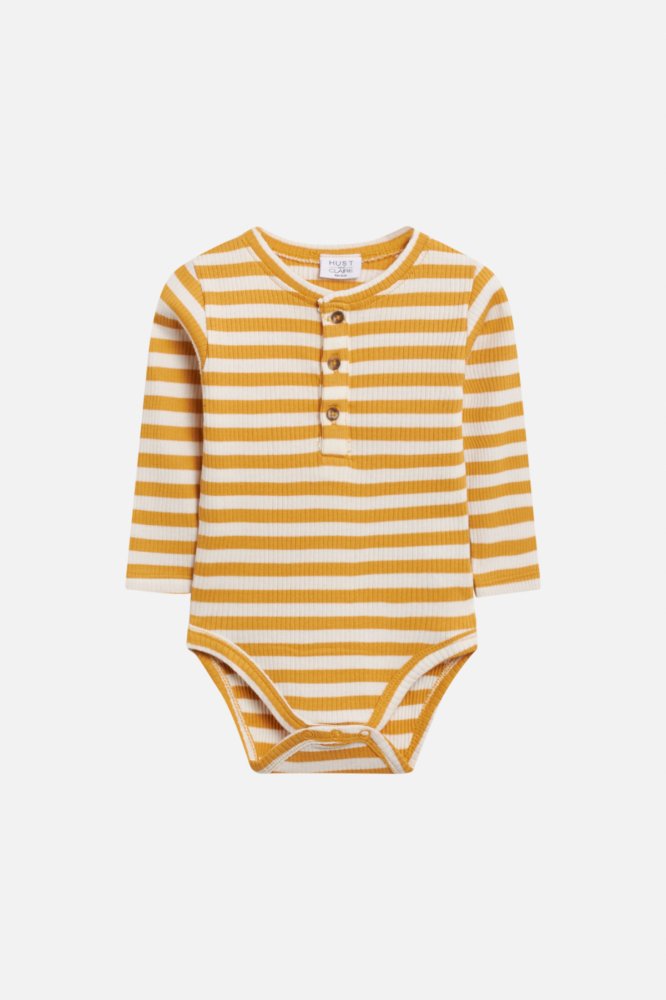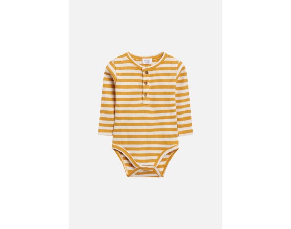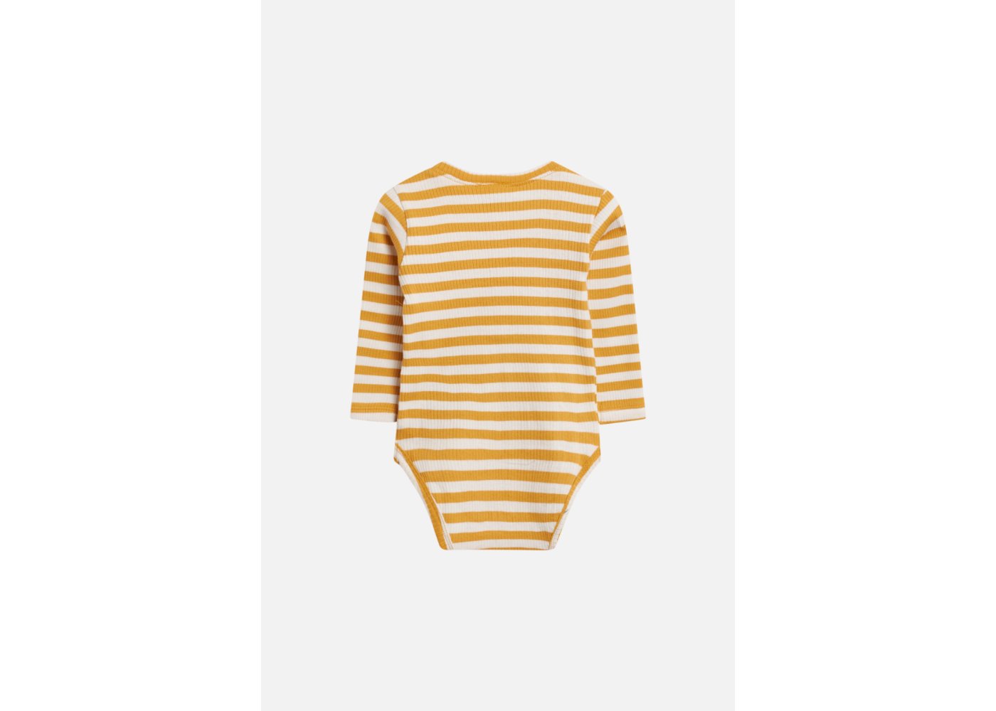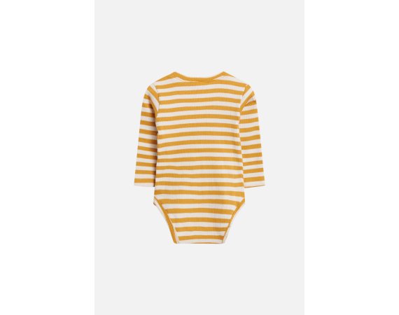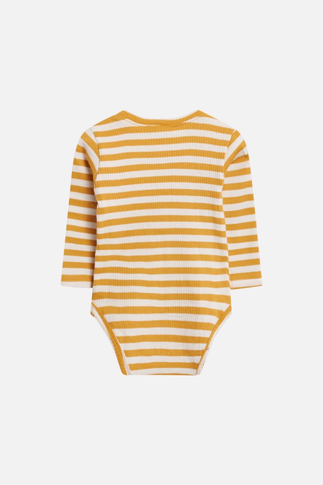 Sød body med striberBody med lange ærmer, stolpelukning og smal fast kant ved halsudskæring og ben.