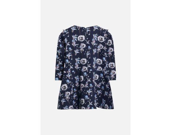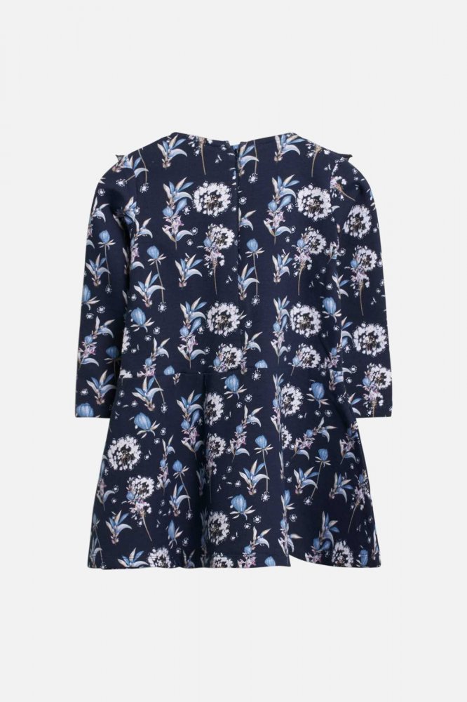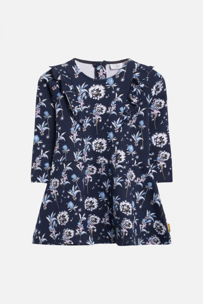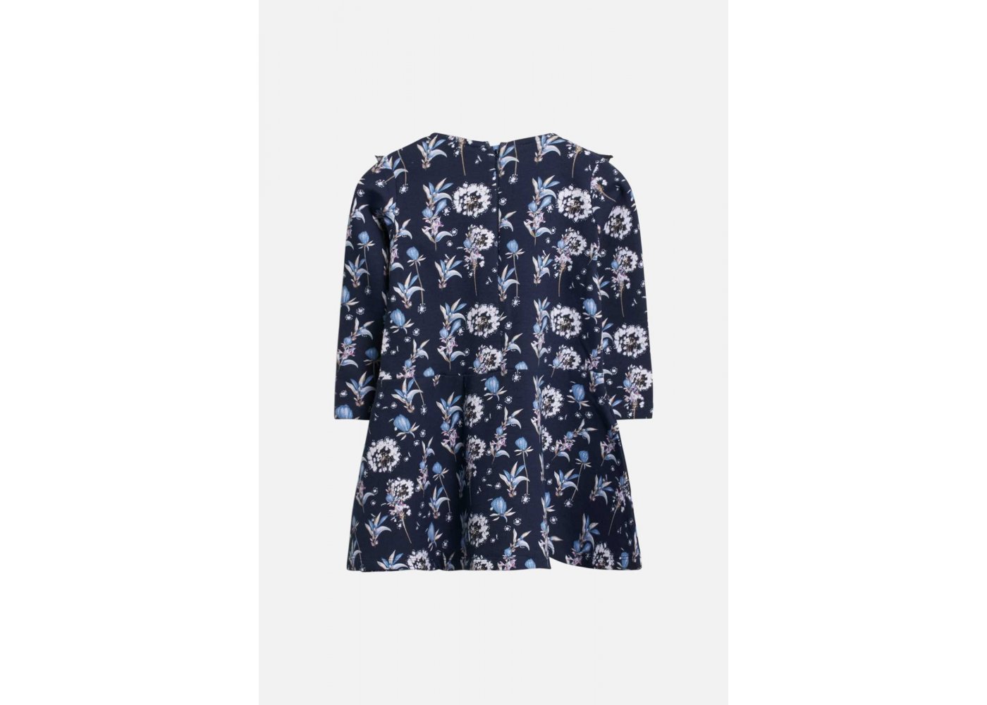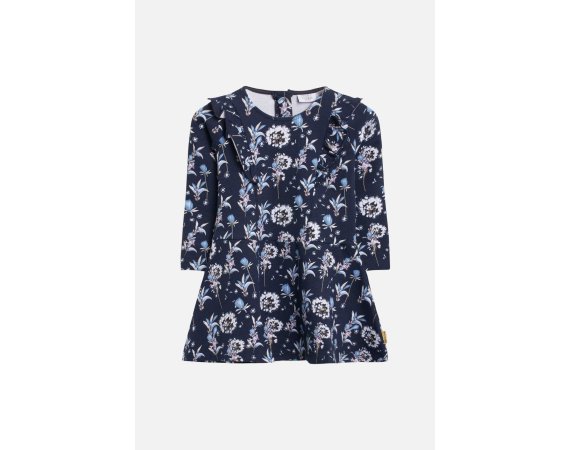 Kjolen har lange ærmer og flæsedetaljer på skuldre og bryst.