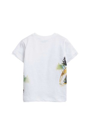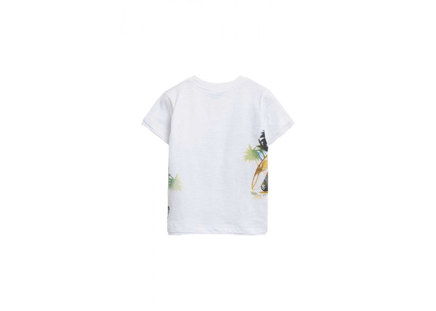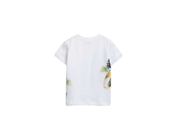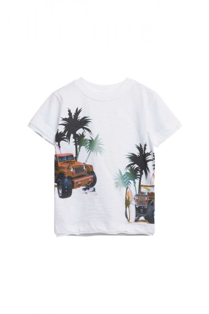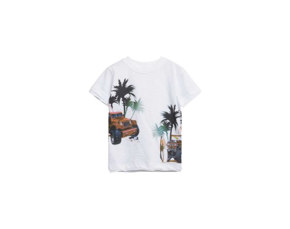 T-shirten har kanter ved alle åbninger og synlige flatlock-stikninger på ærmer og ved opsøm.