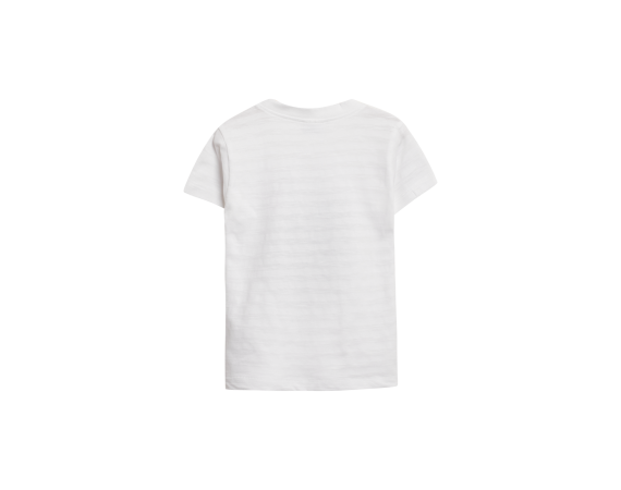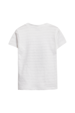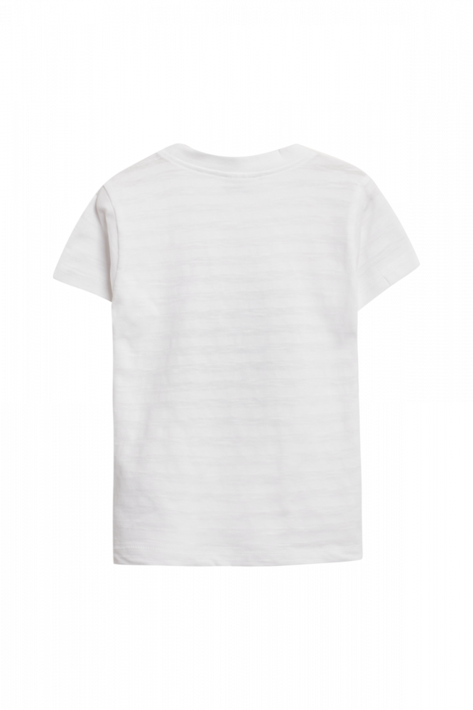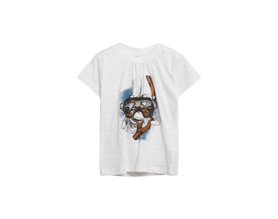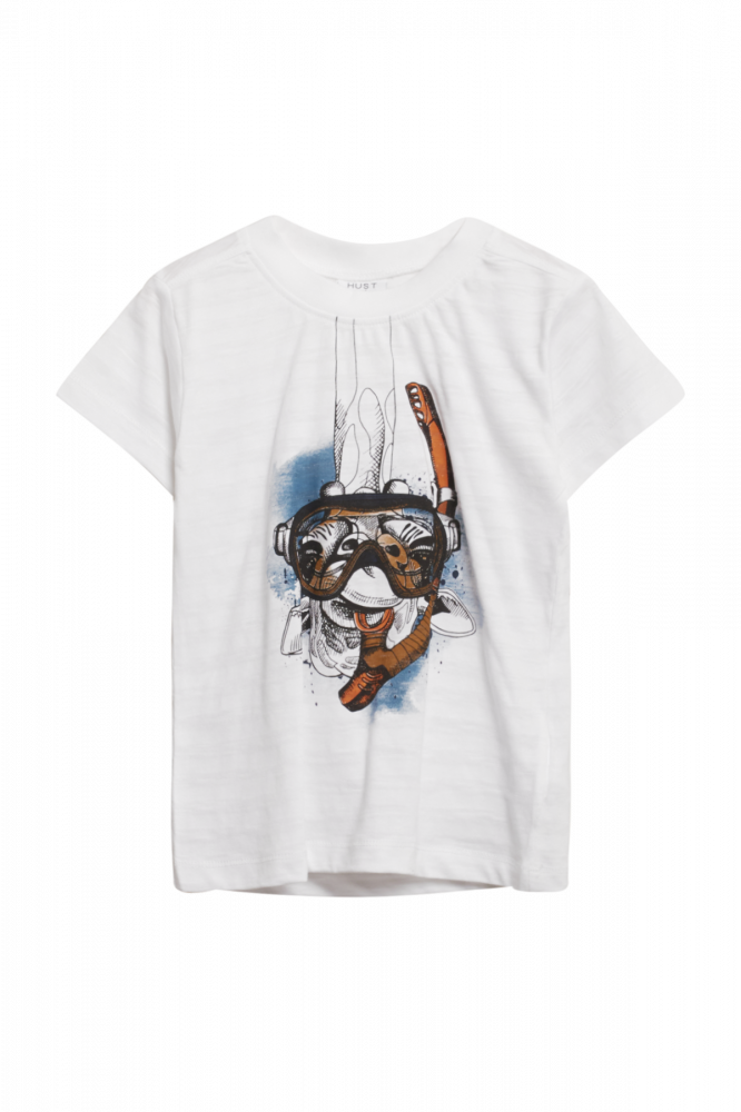 Sjov t-shirt med print af en giraf iført dykkermaskeT-shirt i strækbar jersey med striber, hvor hver anden stribe er lettere gennemsigtig og synlige flatlock-stikninger på ærmer og ved opsøm.