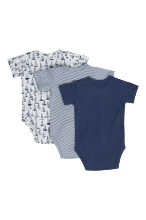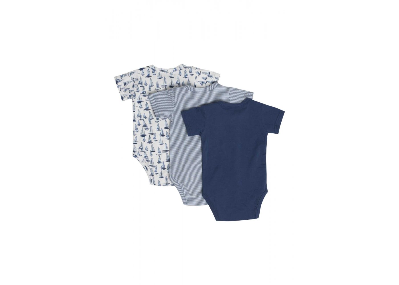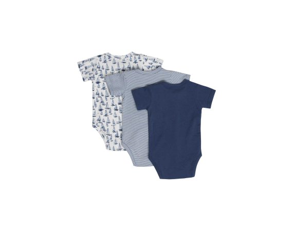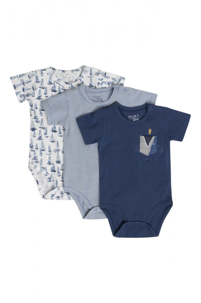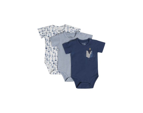 Tre bodyer i forskellige designs med korte ærmer i lækker strækbart jersey stofSættet består af en stribet body, en ensfarvet body med en brystlomme udformet som en haj, og en body fyldt med både.
