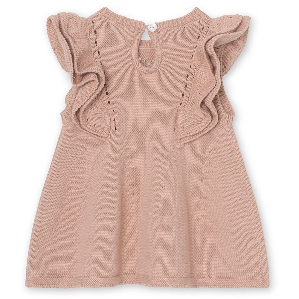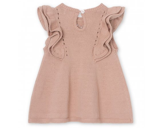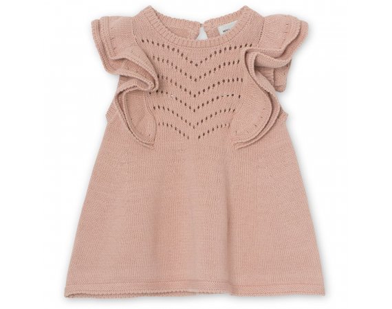 Yndig og lækker strikket kjole fra MINI A TURE.Kjolen har to lag flæser ved skuldre og hulmønster på brystet foran og et lille smalt hulmønster ved flæse og skulderkant bagpå. Den har faste smalle ribkanter ved alle åbninger og lukkes bagpå ved en fin dråbeåbning og knap, der gør den nem at tage på og af igen.