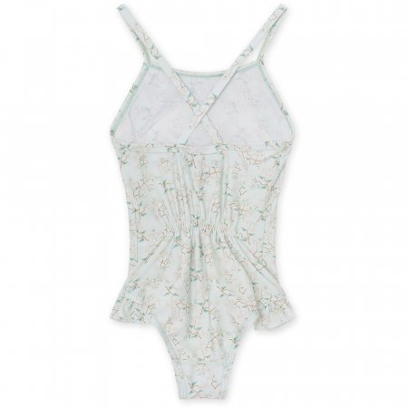 Smuk badedragt med flot grønt blomsterprint fra MINI A TURE.Badedragten har flæsekanter på bryst og ved benåbninger. Den har smalle skulderstropper, der krydser på ryggen. Desuden tynde elastikkanter i alle åbninger og en fin rynke elastik bagpå.