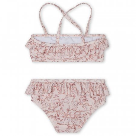 Smuk bikini med flot rosa blomsterprint fra MINI A TURE.Bikinien har smalle skulderstropper, der krydser på ryggen og fine flæser på både top og bukser.