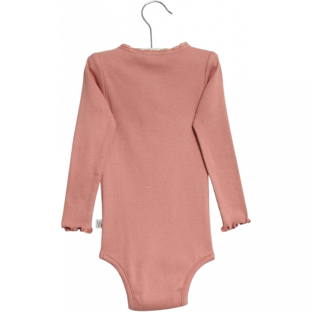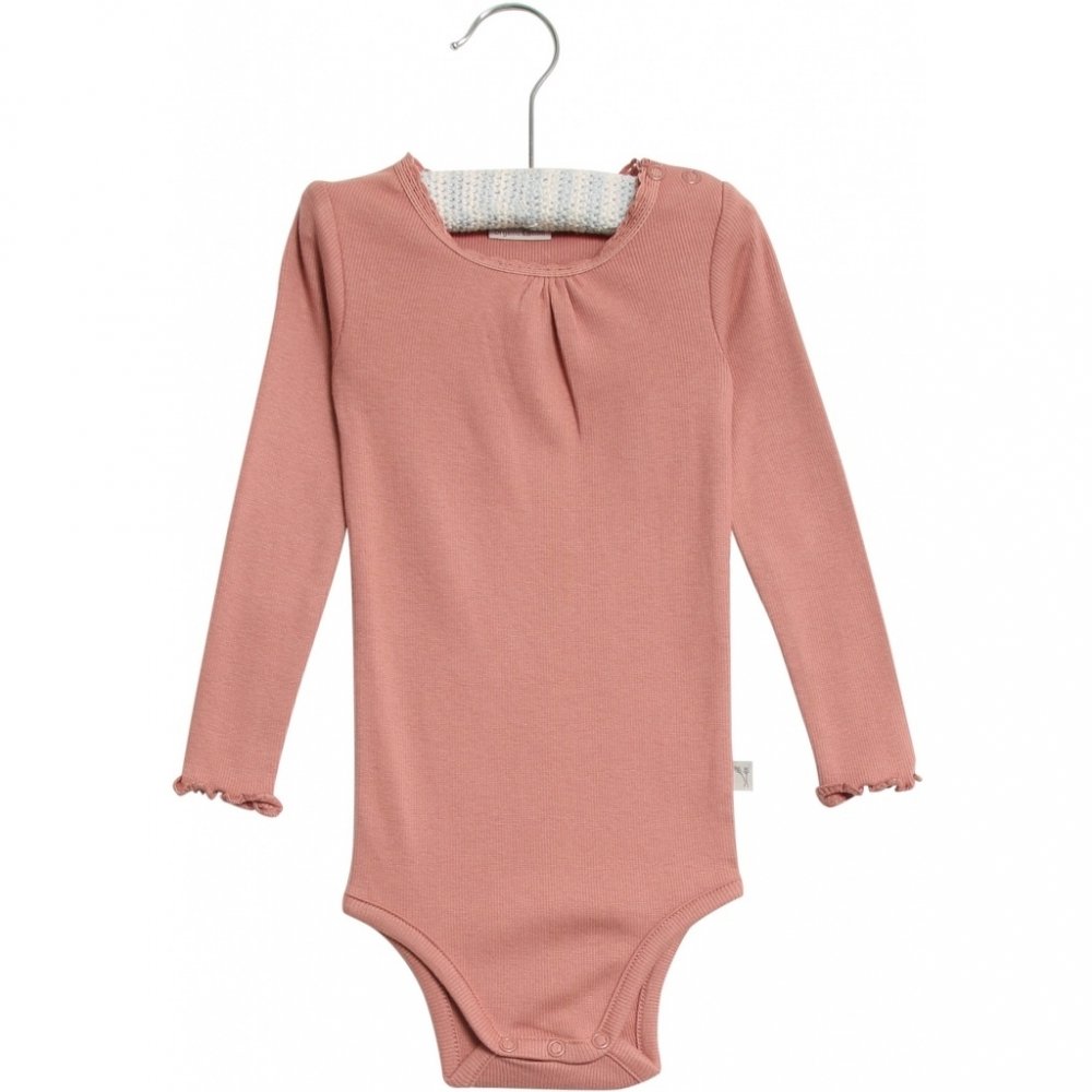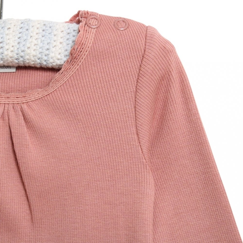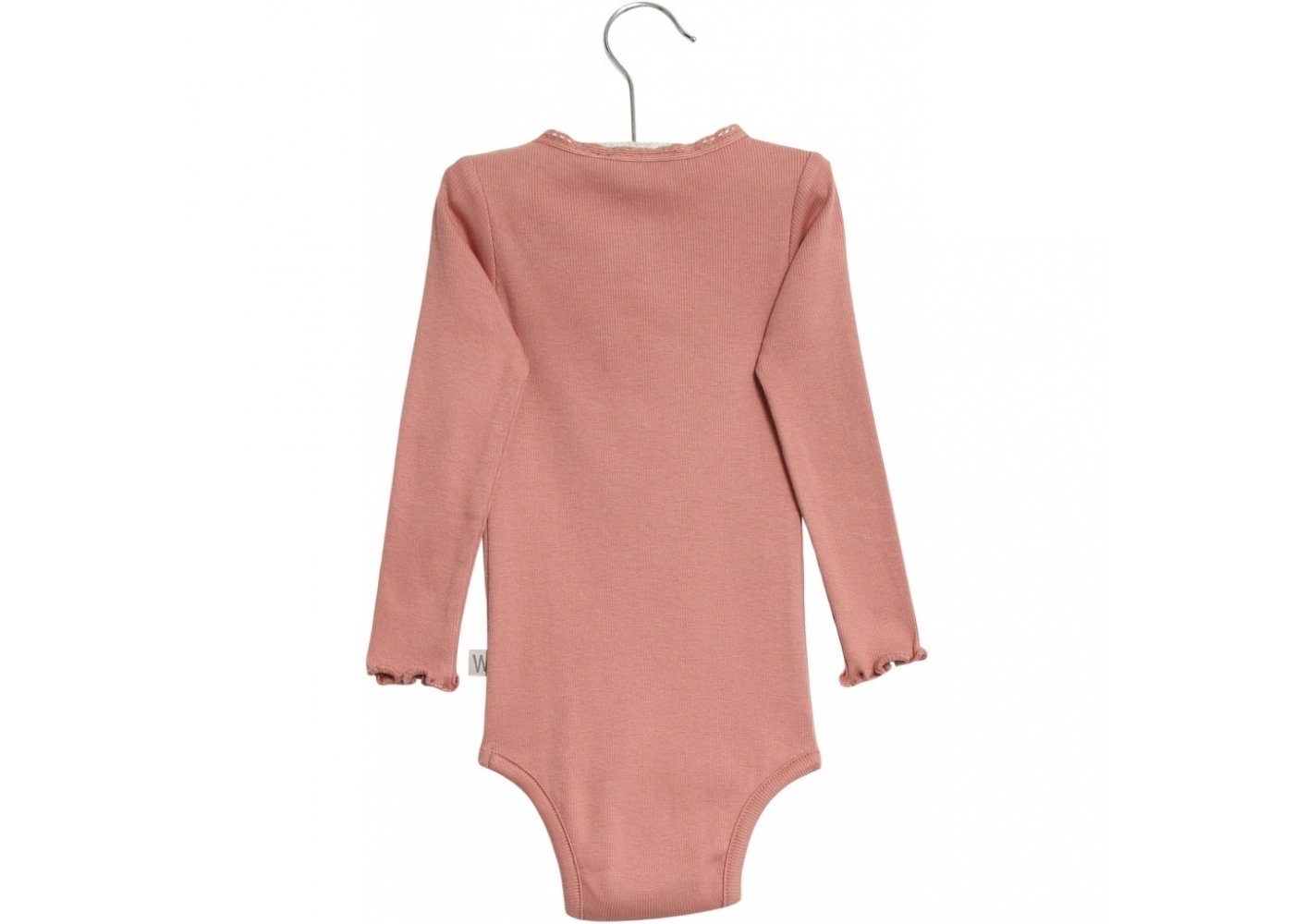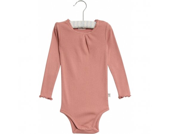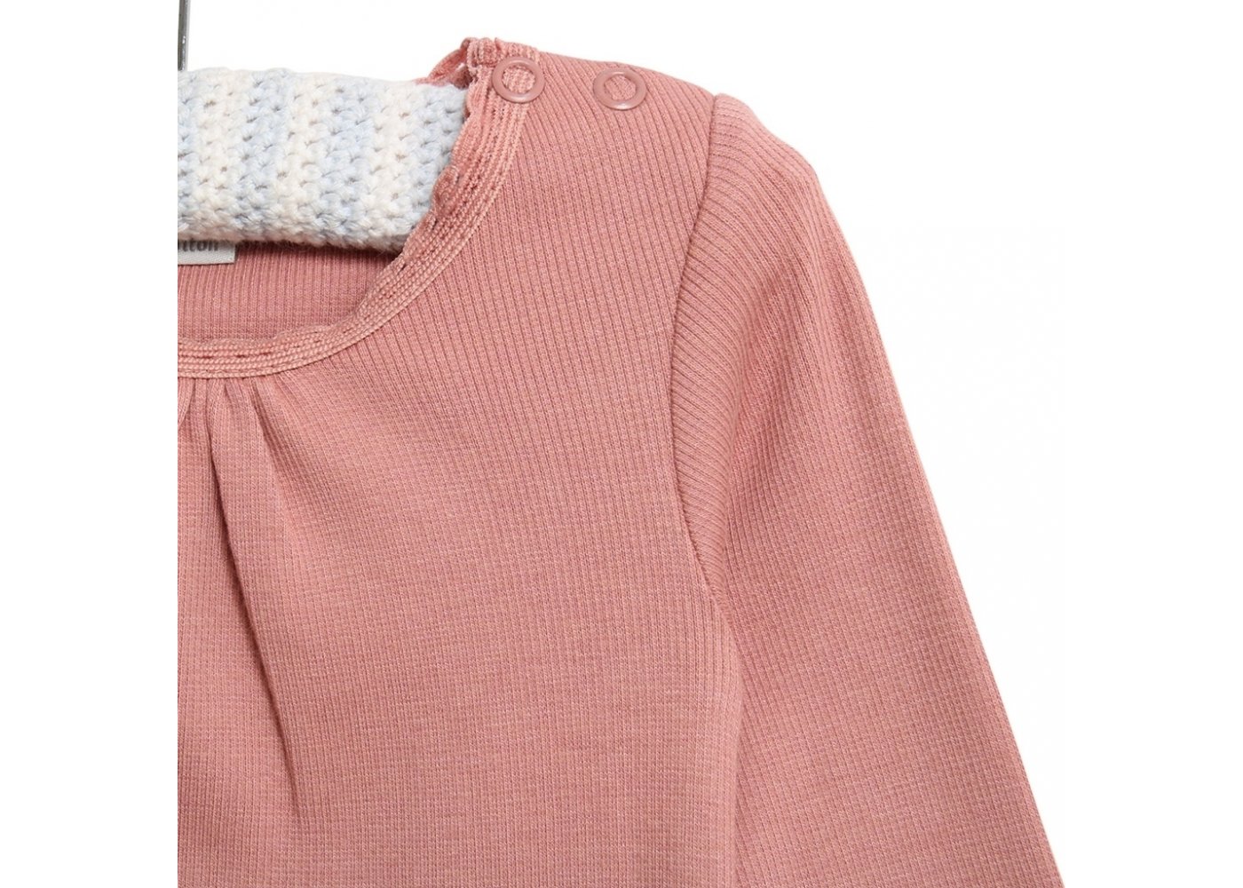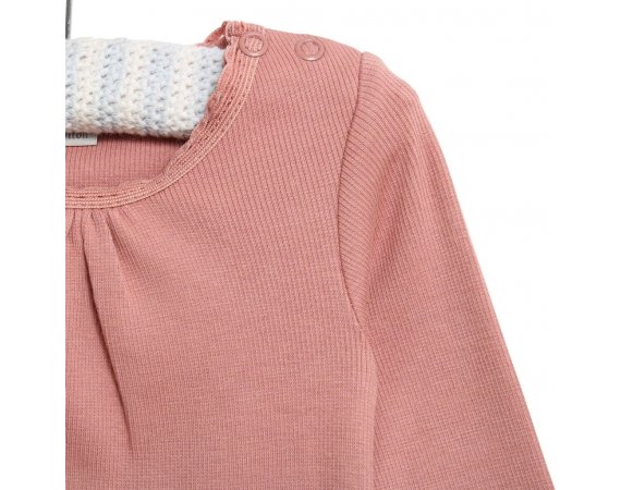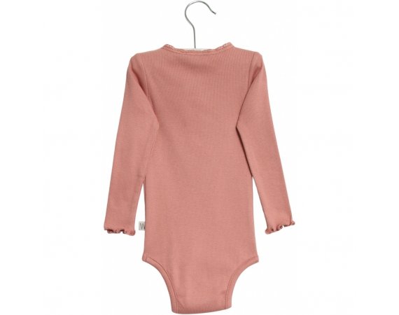 Lækker rib body med lange ærmerBodyen har blondedetalje og rynk ved halsudskæring og er fremstillet i en blød, økologisk bomuldsblanding. Den lukkes med trykknapper på venstre skulder og imellem ben.