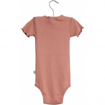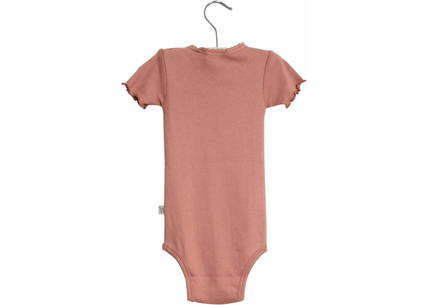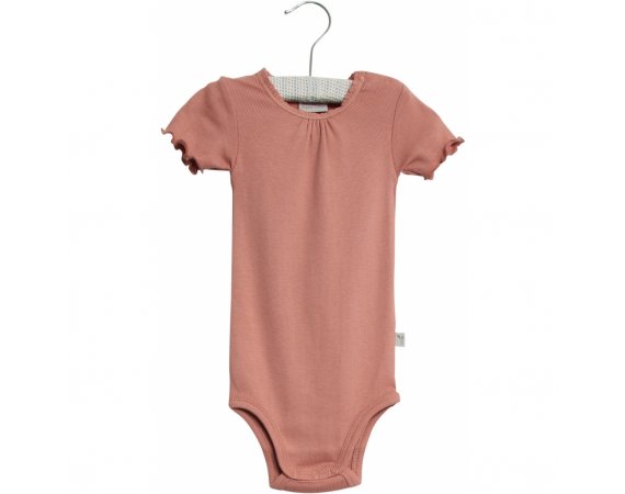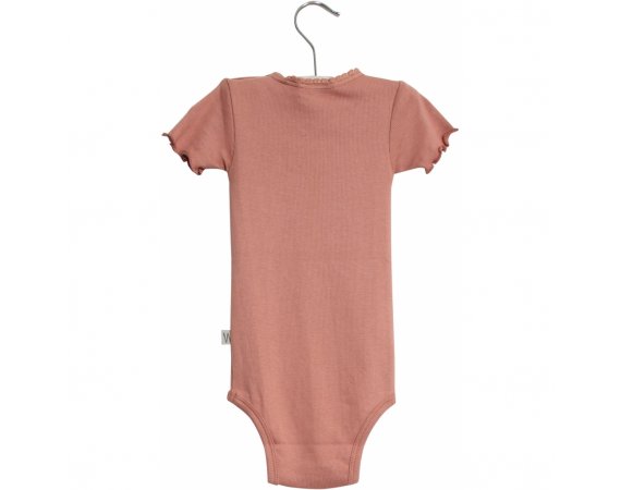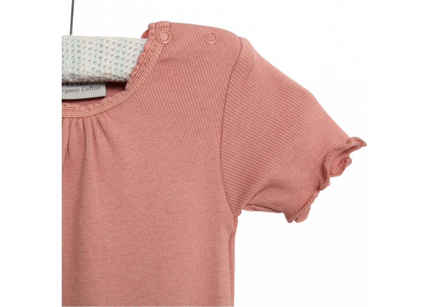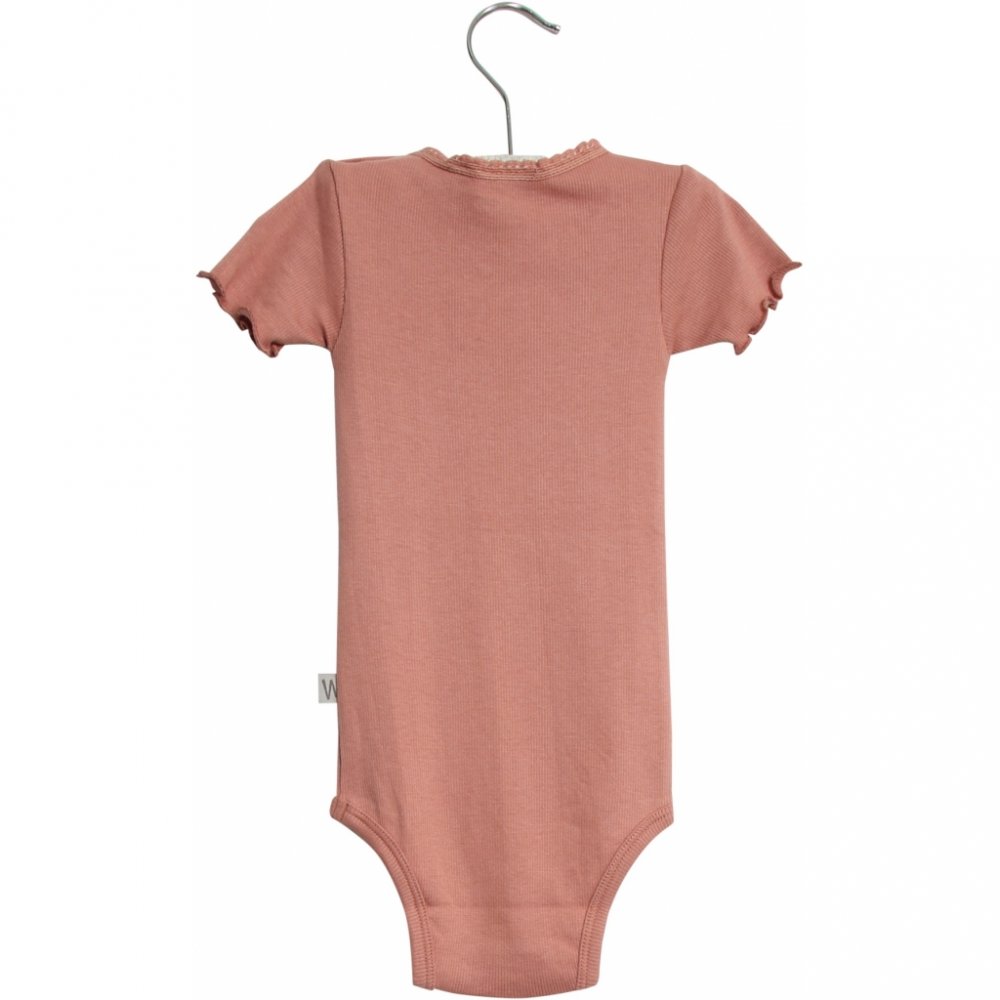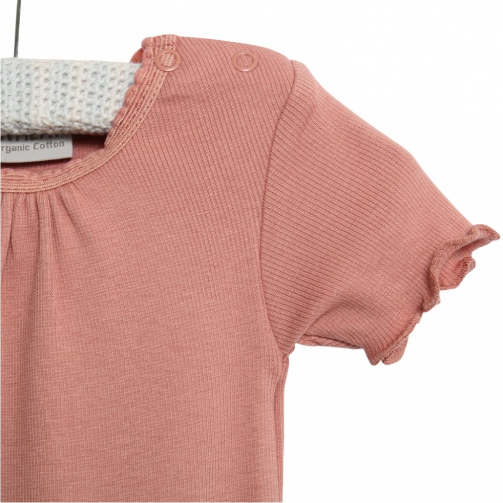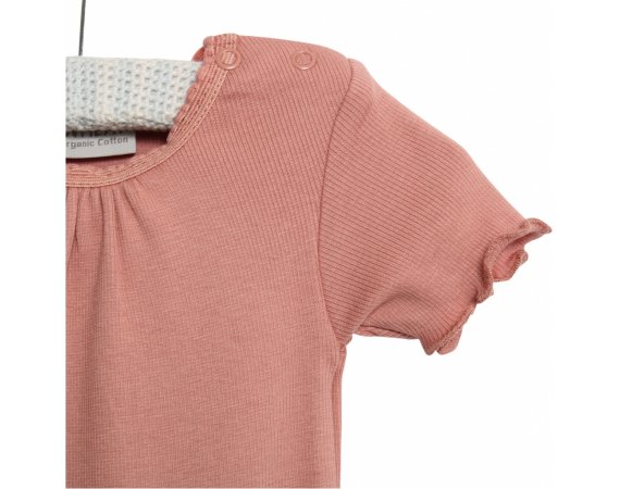 Lækker rib body med korte ærmerBodyen har blonde- og flæse detalje, rynk ved halsudskæring og er fremstillet i en blød, økologisk bomuldsblanding. Den lukkes med trykknapper på venstre skulder og imellem ben.