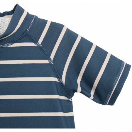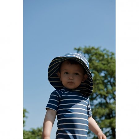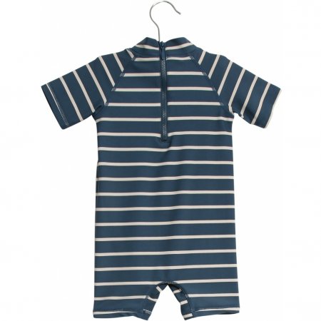 Wheat heldragt med flotte striberHeldragt med lille krave, korte ærmer og ben. Dragten lukkes bagpå med lynlås.