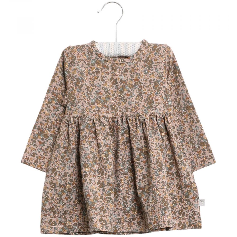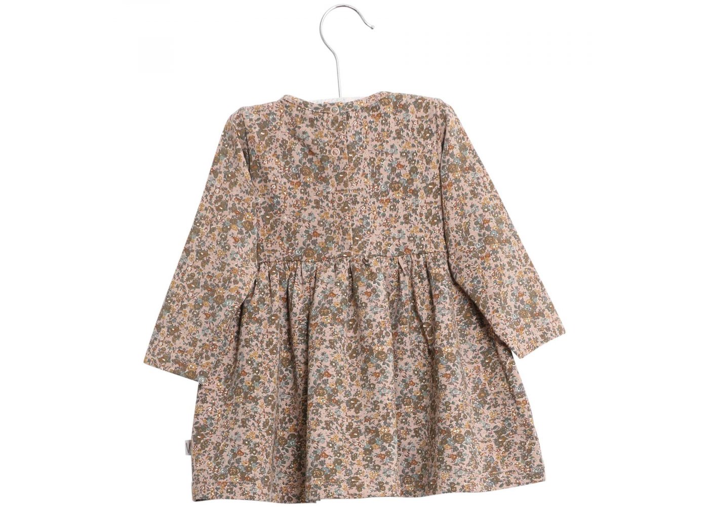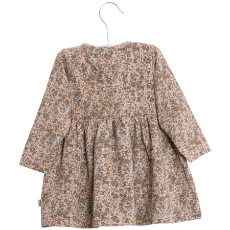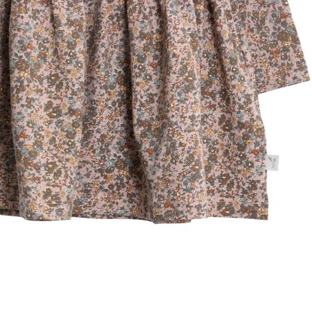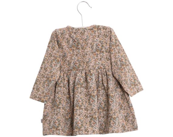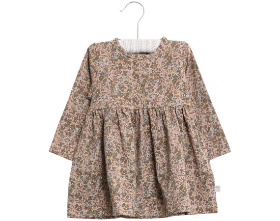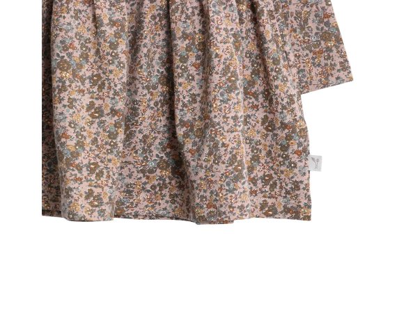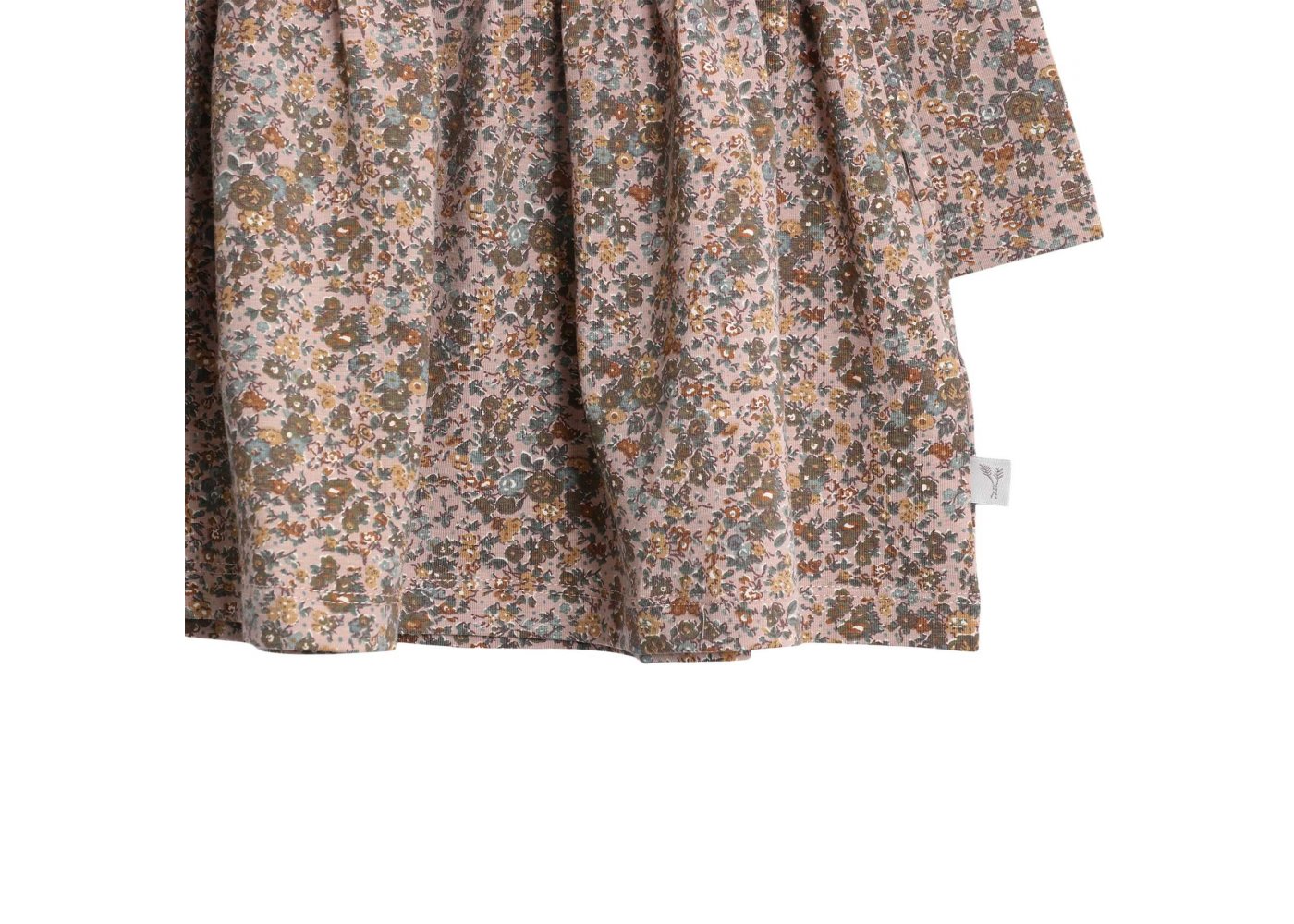 Skøn langærmet kjole med håndtegnet design blomster printKjolen har overskæring i taljen med rynk og vidde i skørtet. Den lukkes bagpå med trykknap lukning og er fremstillet i blød økologisk bomuld.