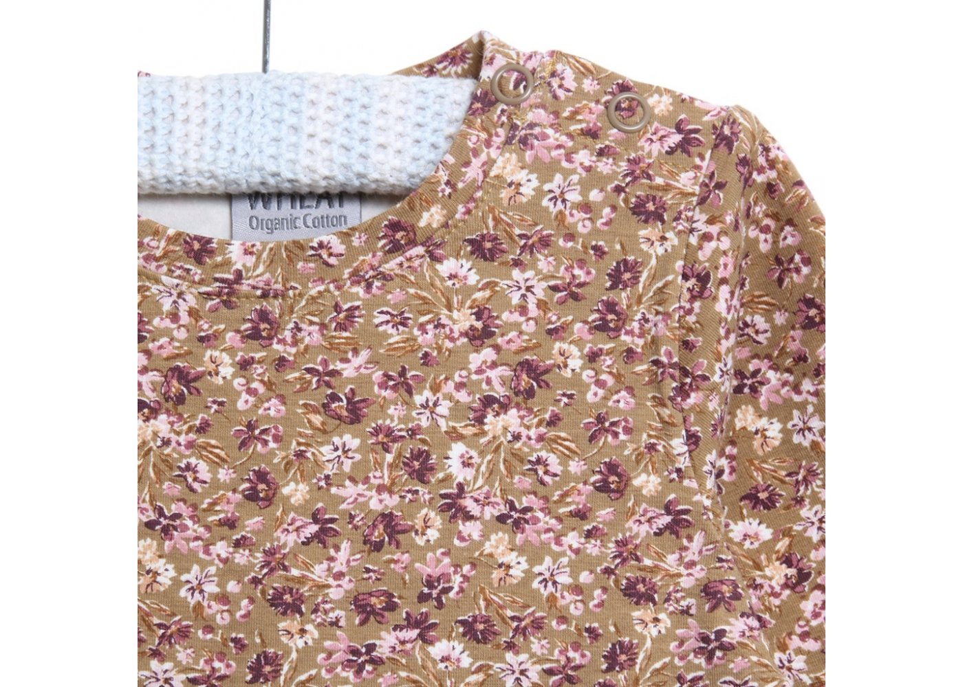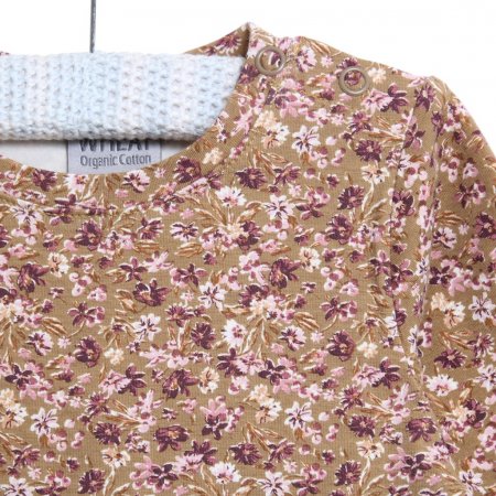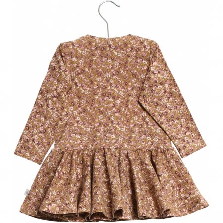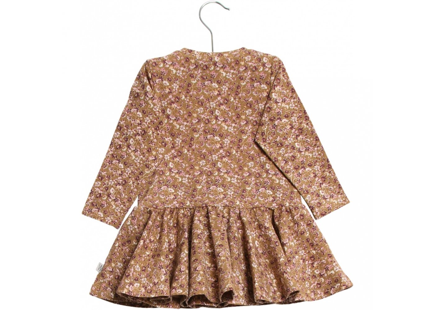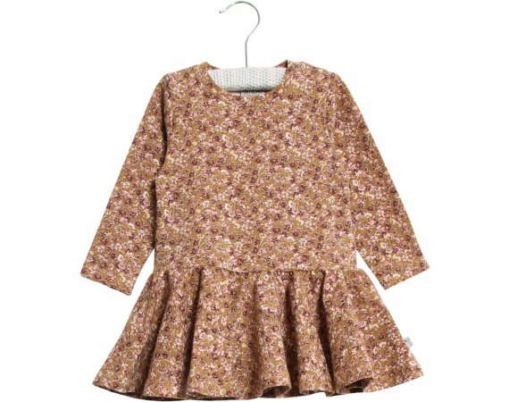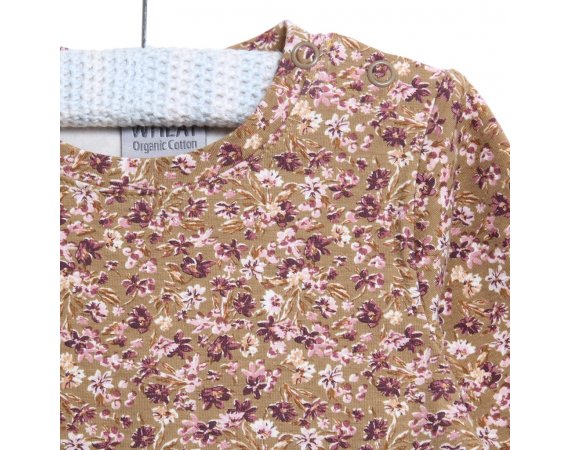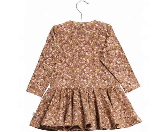 Skøn langærmet kjole fremstillet i økologisk bomuld med håndtegnet blomster printKjolen har overskæring i talje og rynk, der giver en flot vidde i skørtet. Den har knapåbning på venstre skulder.