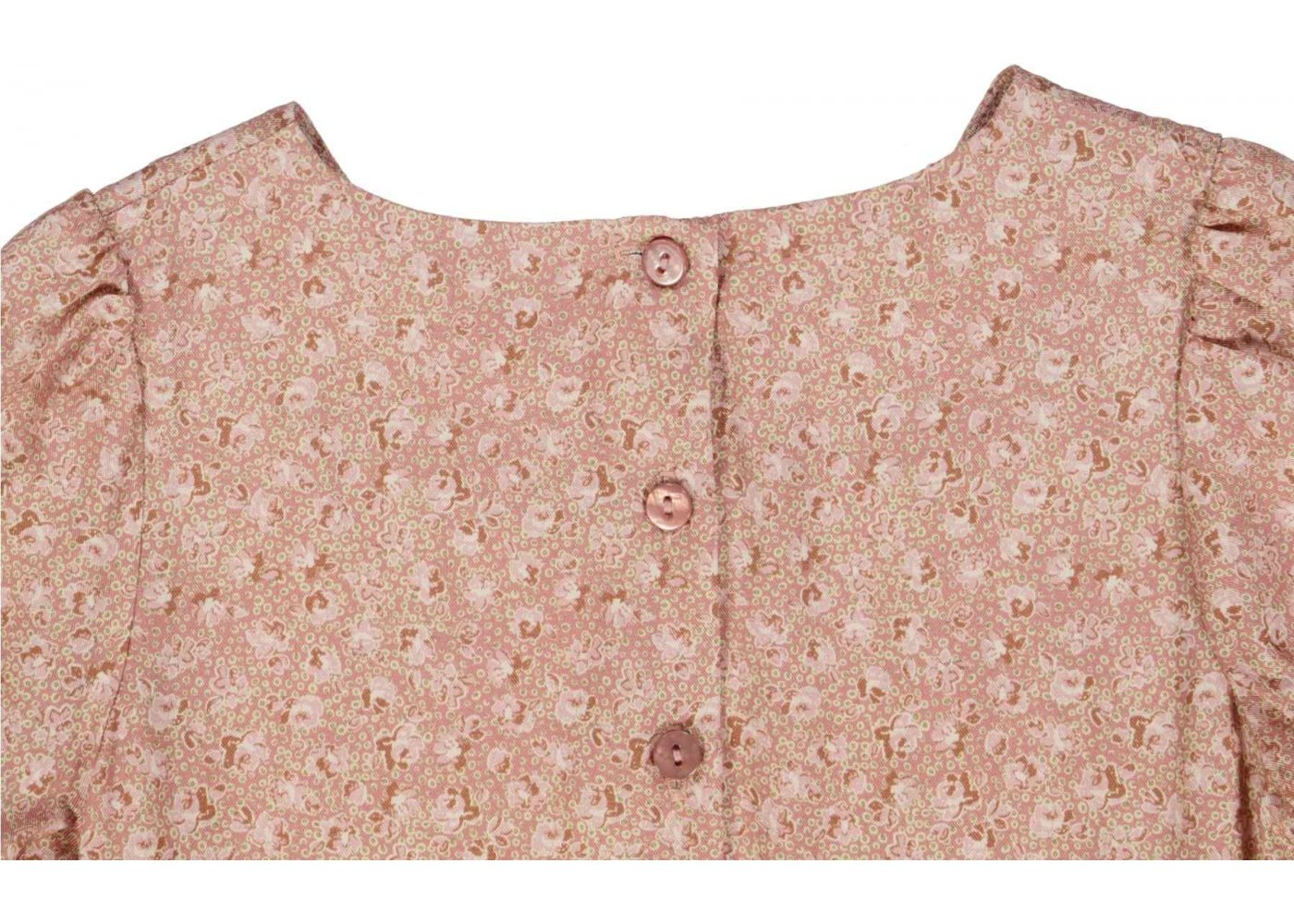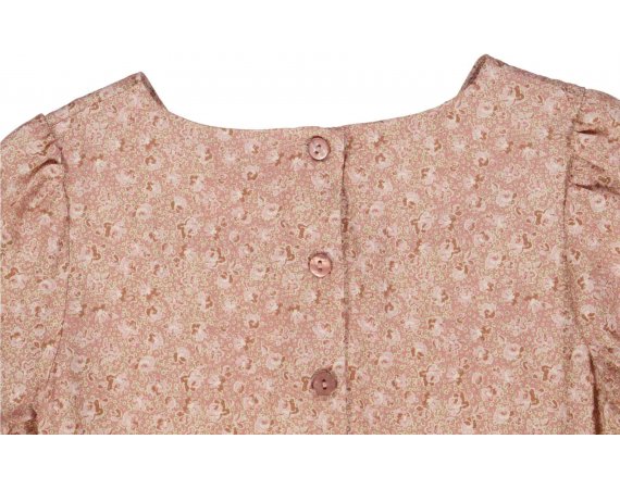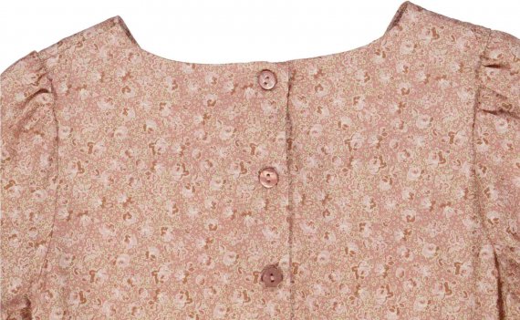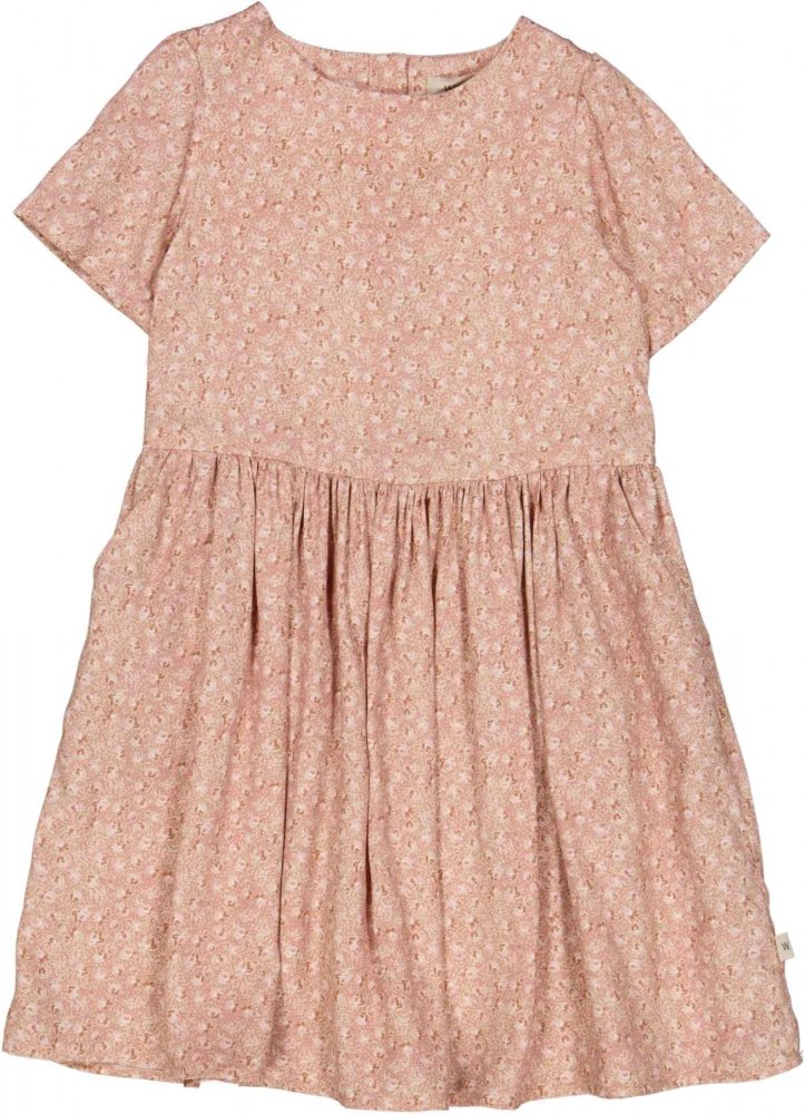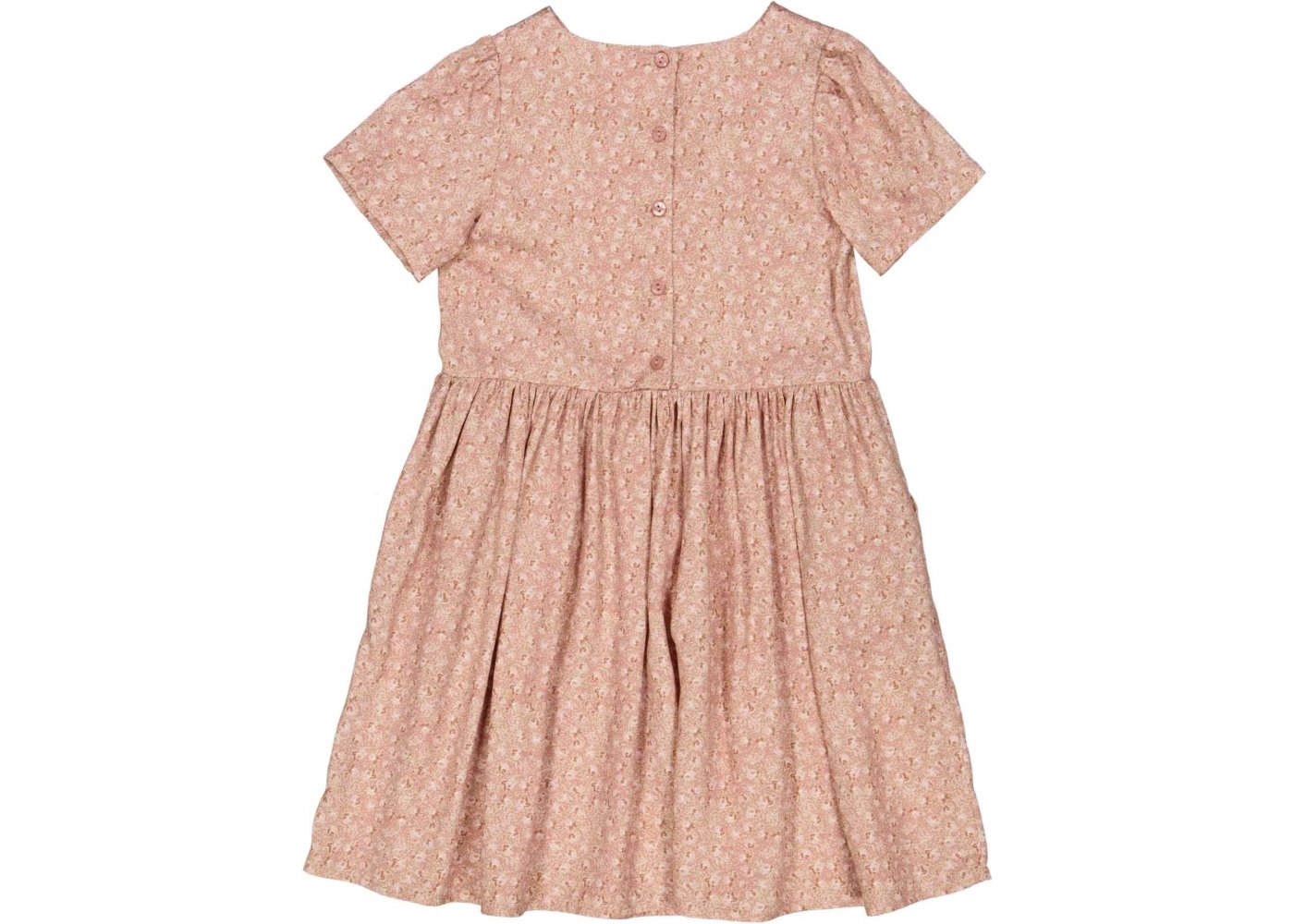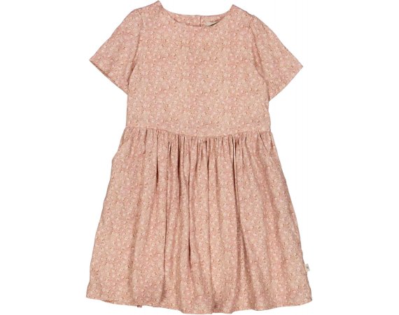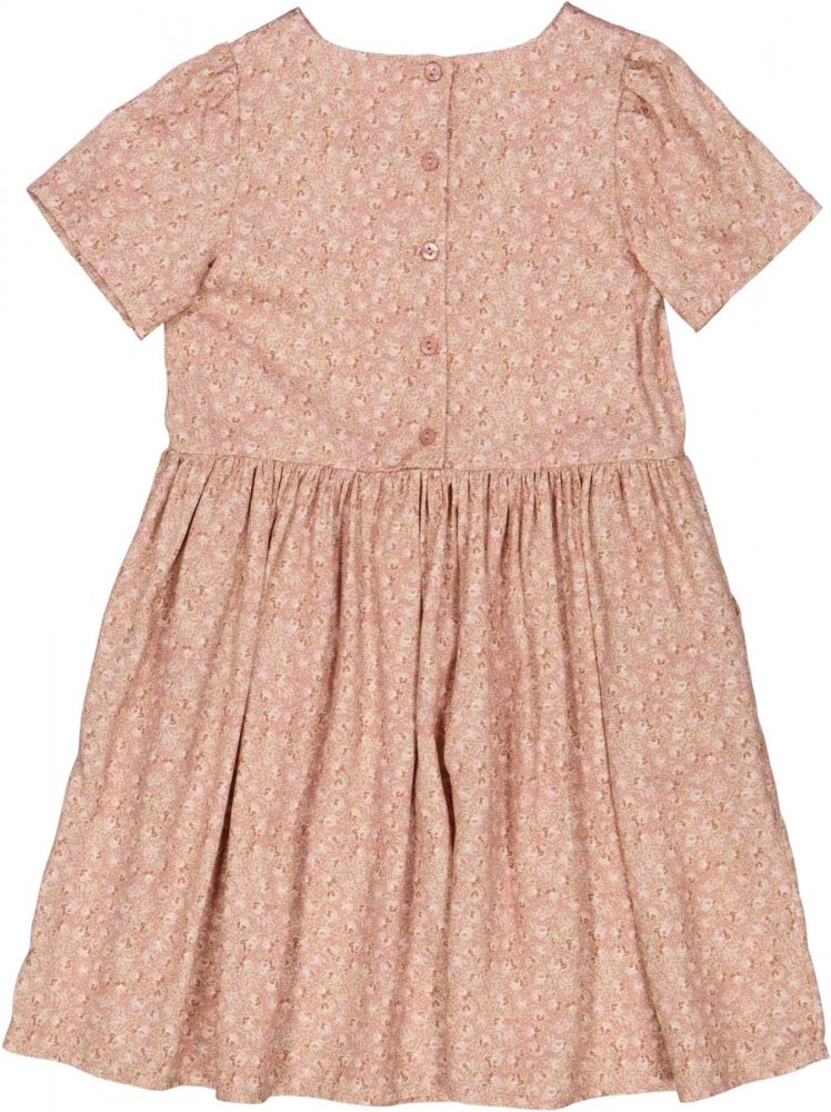 Kjolen har korte ærmer, overskæring i liv med fint rynk og sidelommer. Kjolen lukkes med knapper på ryggen.