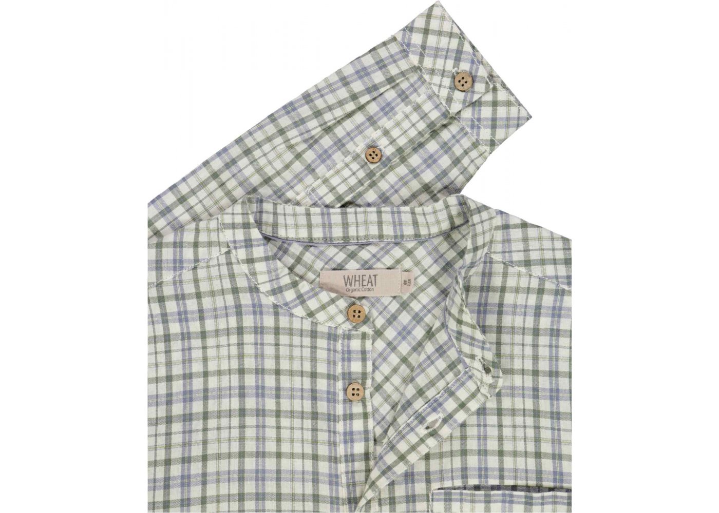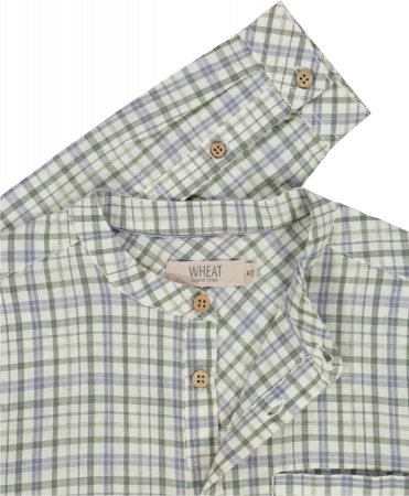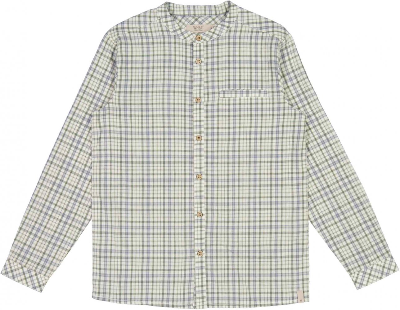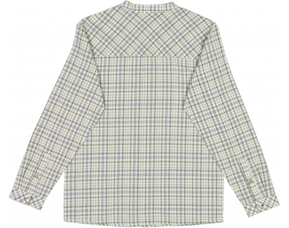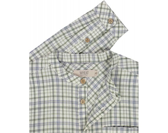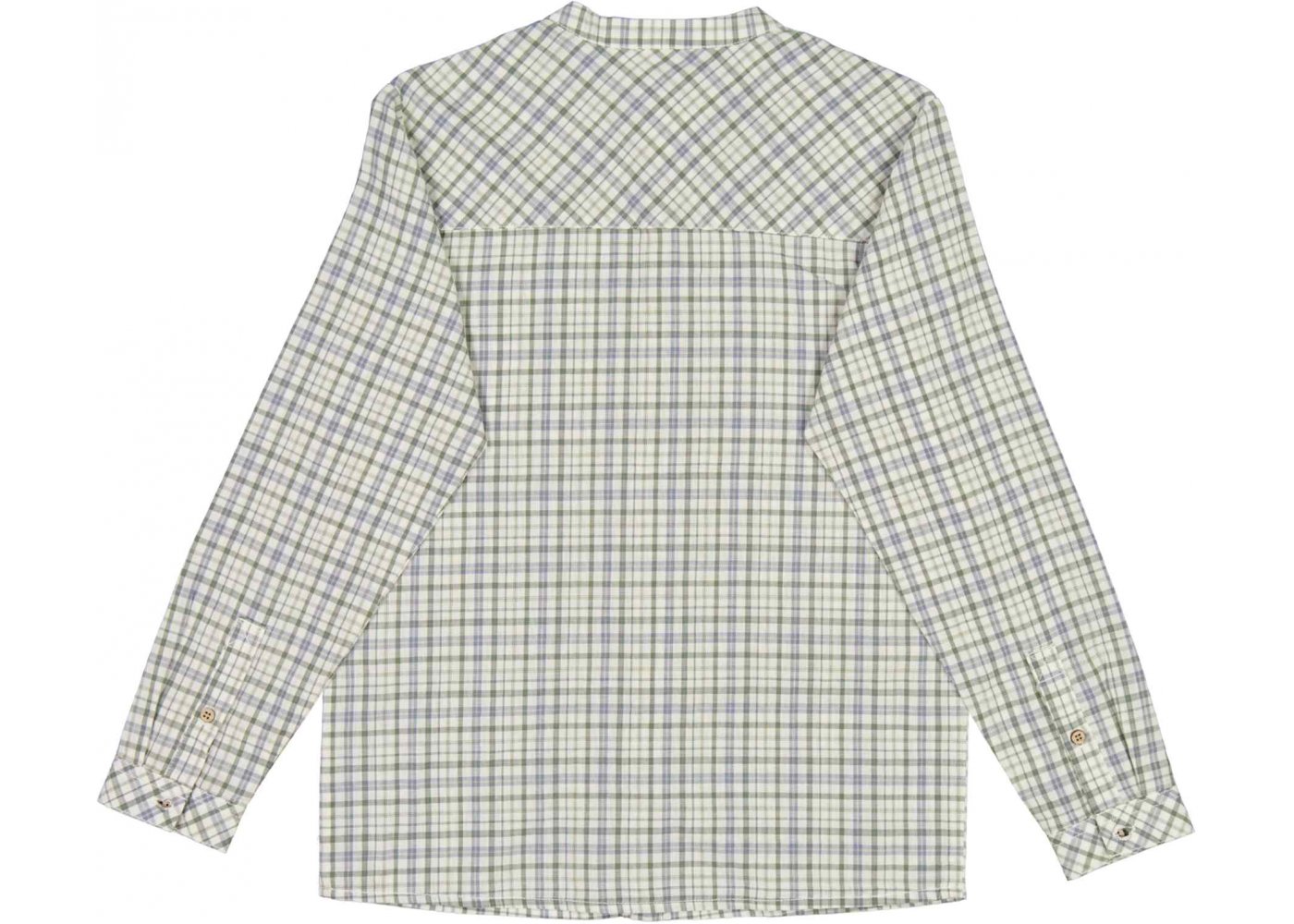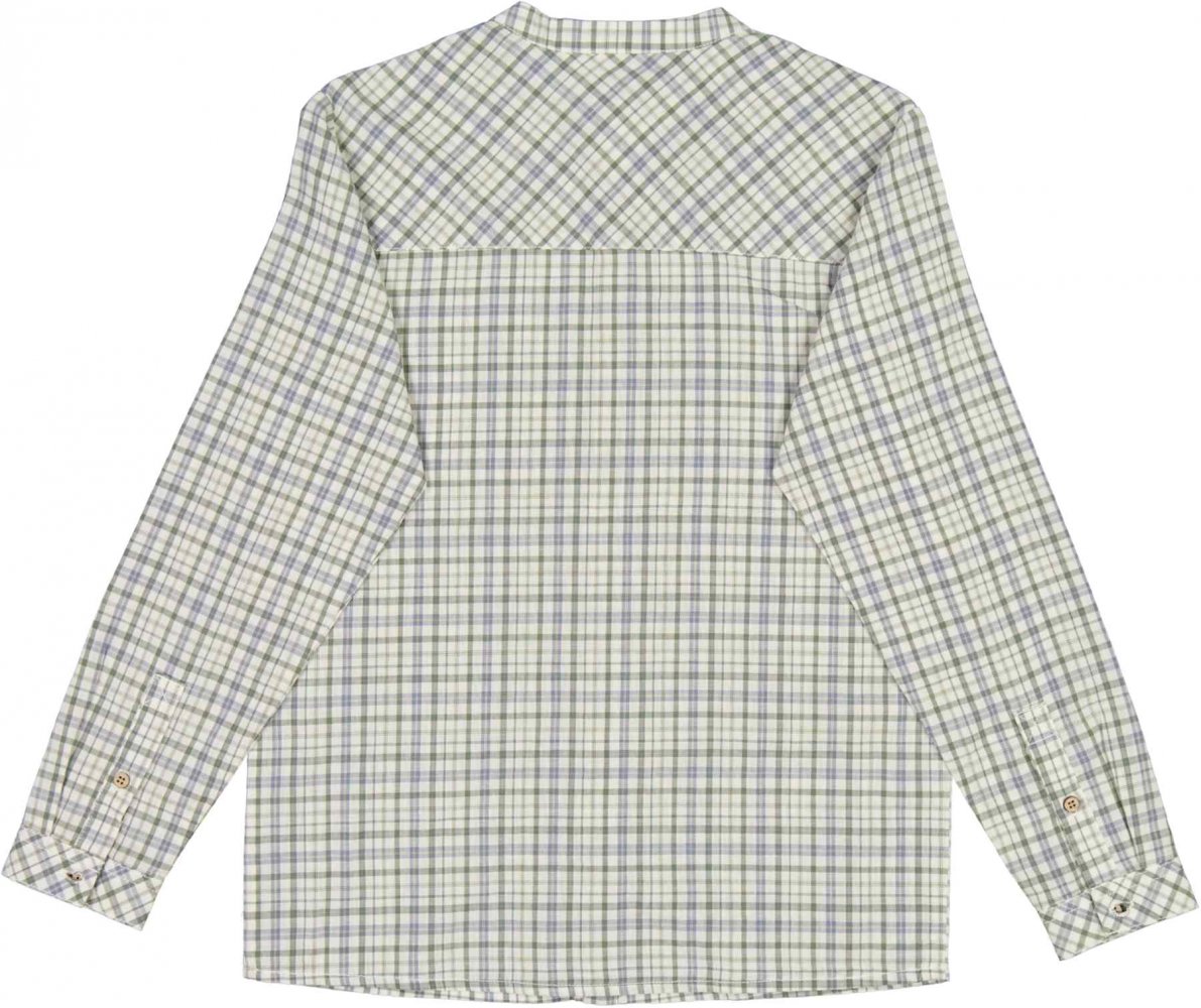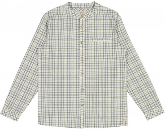 Skjorten har kinakrave, en skjult brystlomme og lukkes med knapper foran.